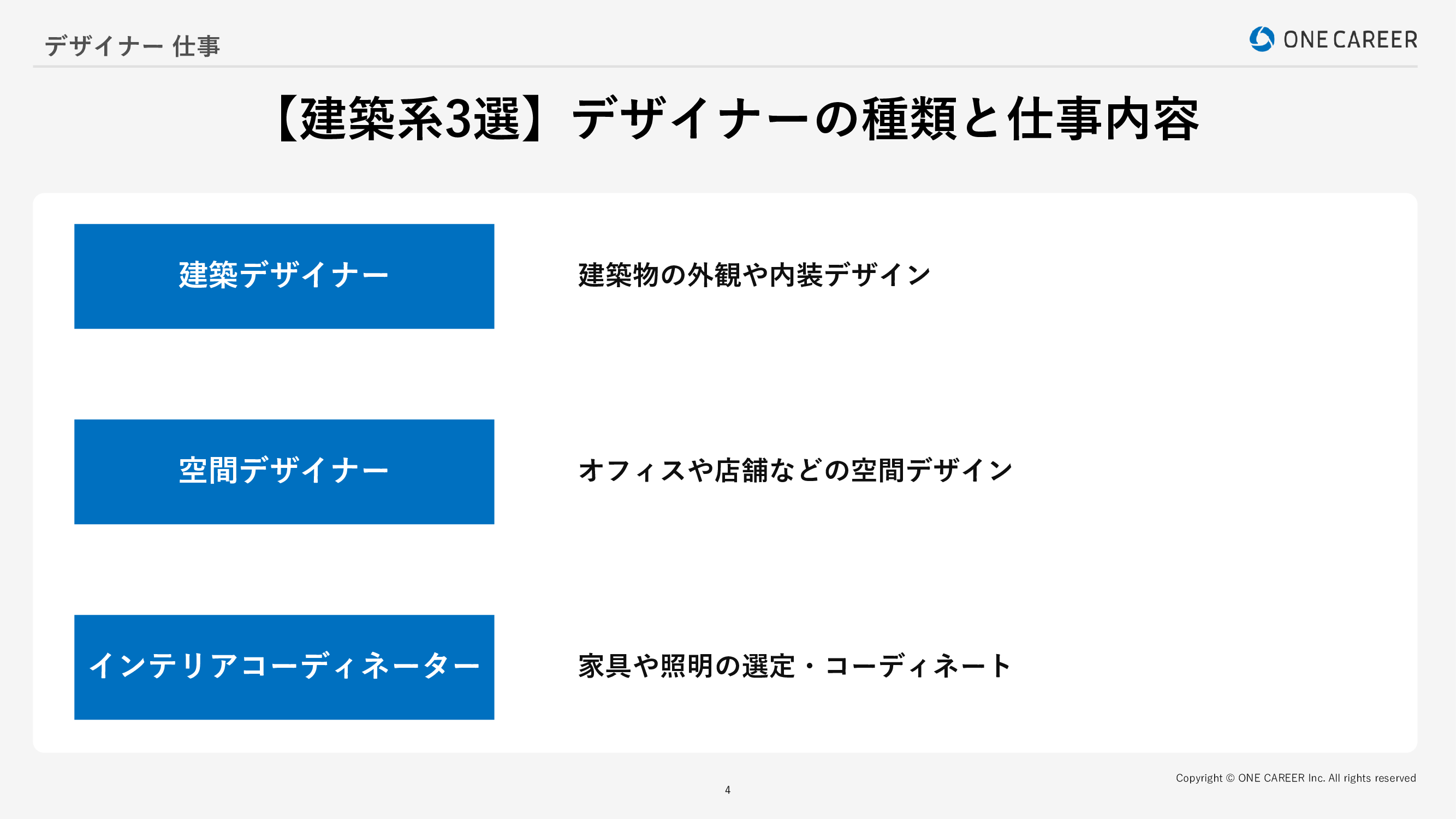 建築に関わるデザイナーには、以下の3つの職種があります。