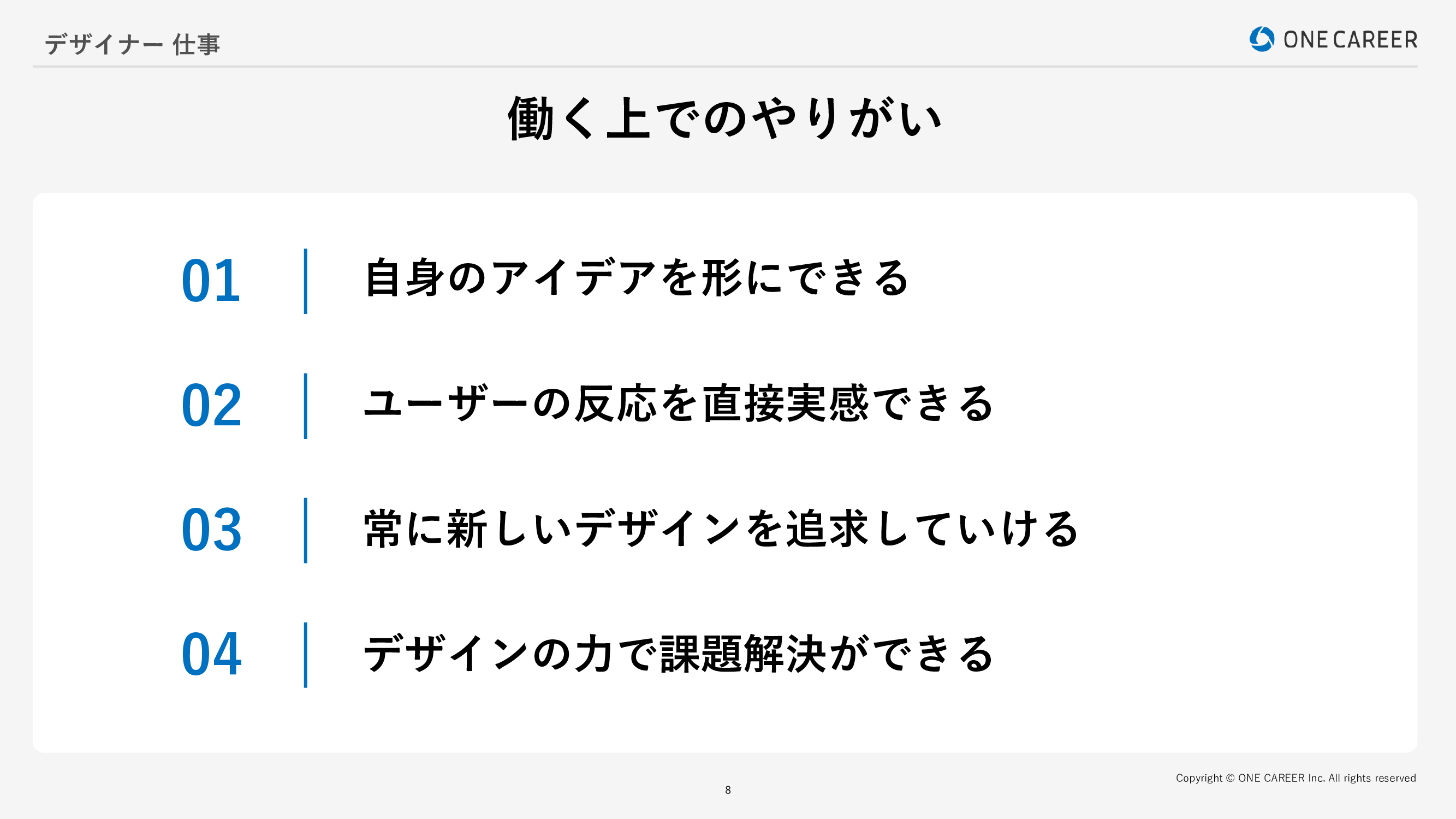 いかがでしたか。今回はデザイナーの仕事についてご紹介しましたが、他にもさまざまな職種があります。自己紹介などを通じて自分に合った、自分がしたい仕事をぜひ探してみてください。