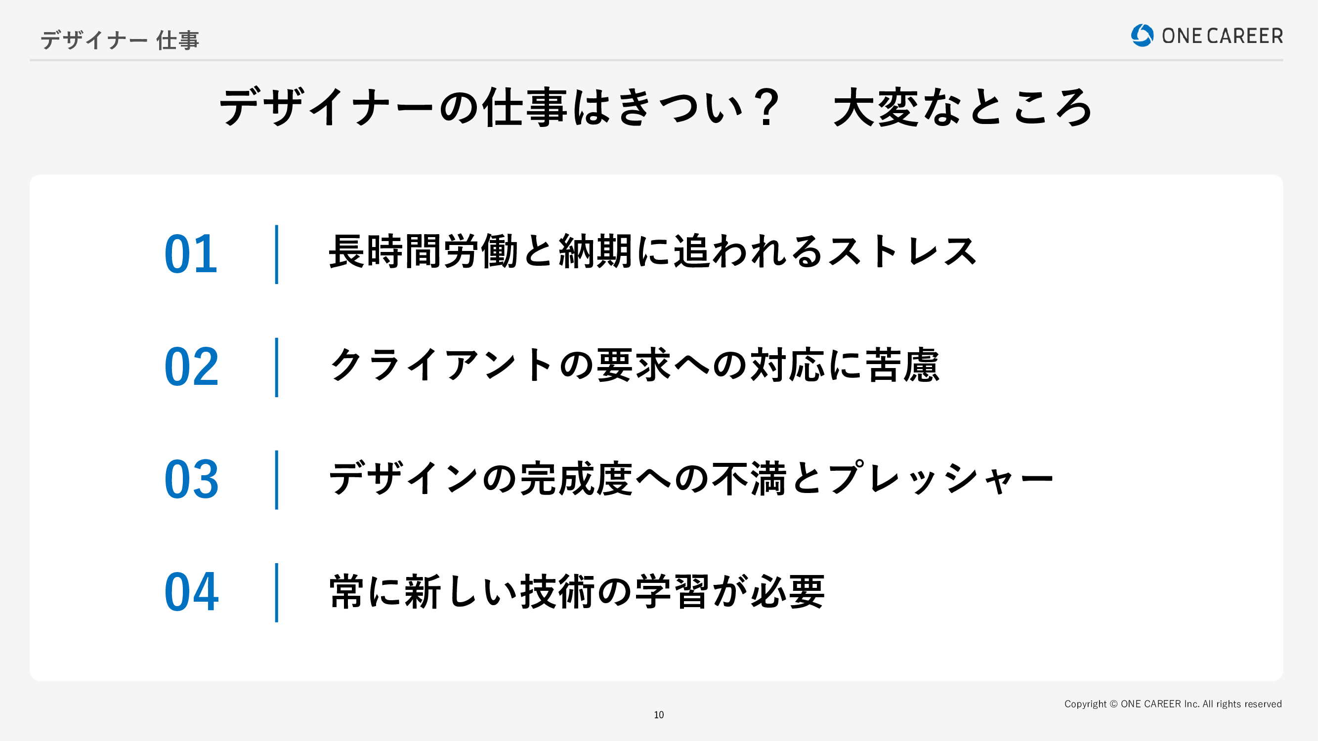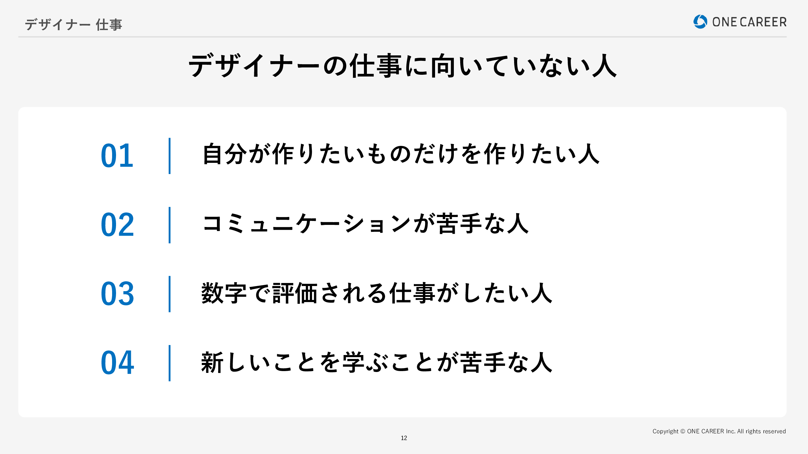 <目次> ●デザイナーの仕事とは? 仕事内容と魅力 ・デザイナーの仕事とは? ・【ネット・メディア系5選】デザイナーの種類と仕事内容 ・【紙媒体系5選】デザイナーの種類と仕事内容 ・【製品系8選】デザイナーの種類と仕事内容 ・【建築系3選】デザイナーの種類と仕事内容 ●デザイナーの主なキャリアパス ・主なキャリアパス ・未経験・他職種からデザイナーになる方法 ・デザイナーが目指せる職種 ・他職種・未経験からデザイナーへのキャリアパス・転職事例 ・デザイナーから他職種へのキャリアパス・転職事例 ●デザイナーの仕事のやりがい・年収・将来性 ・働く上でのやりがい ・デザイナーの年収・待遇 ・デザイナーの仕事がなくなるといわれる理由 ●デザイナーの仕事はきつい? 大変なところ ・長時間労働と納期に追われるストレス ・クライアントの要求への対応に苦慮 ・デザインの完成度への不満とプレッシャー ・常に新しい技術の学習が必要 ●デザイナーの仕事は未経験でも可能? 向いている人の特徴 ・コミュニケーション能力が高い人 ・発想力がある人 ・粘り強い人 ・スケジュール管理が得意な人 ・学ぶ姿勢がある人 ・創造力が豊かな人 ・新しいものや流行のものが好きな人 ●デザイナーの仕事に向いていない人 ・自分が作りたいものだけを作りたい人 ・コミュニケーションが苦手な人 ・数字で評価される仕事がしたい人 ・新しいことを学ぶことが苦手な人 ●デザイナーに求められるスキル ・デザインスキル ・色彩感覚 ・デザインソフトを扱う技術力 ・トレンドの情報収集力 ・マーケティングスキル ・コミュニケーション能力 ・論理的思考力 ・根気強さ ・スケジュール管理能力 ●デザイナーの仕事に有利に働く資格 ・ファッションに関するデザインに役立つ資格 ・製品に関するデザインに役立つ資格 ・紙に関するデザインに役立つ資格 ・ゲームやWebに関するデザインに役立つ資格 ・空間や環境に関するデザインに役立つ資格 ●デザイナーの選考対策 ・エントリーシート(ES)対策 ・Webテスト対策 ・面接対策 ・OB・OG訪問 ●おわりに