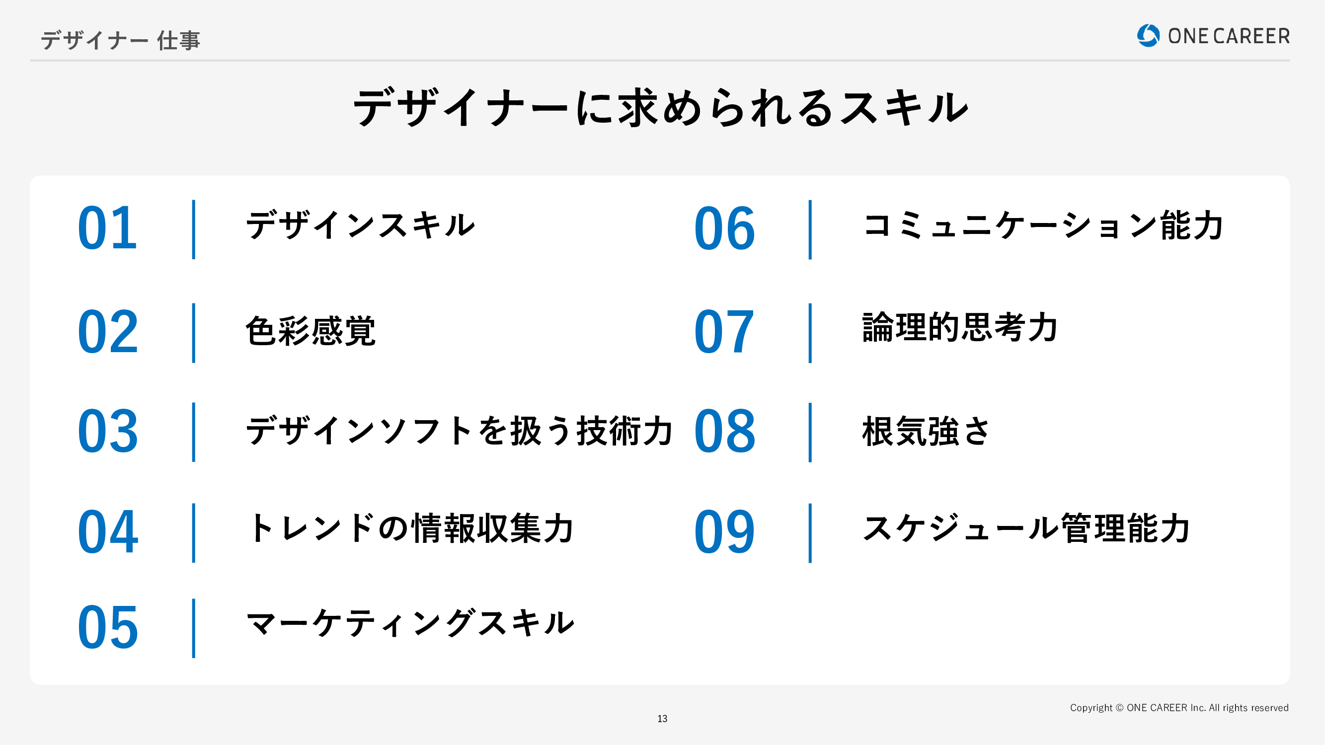 そのため、デザインのコンセプトを決め、各デザイナーに指示を出しながら全体を統括するスキルが求められます。