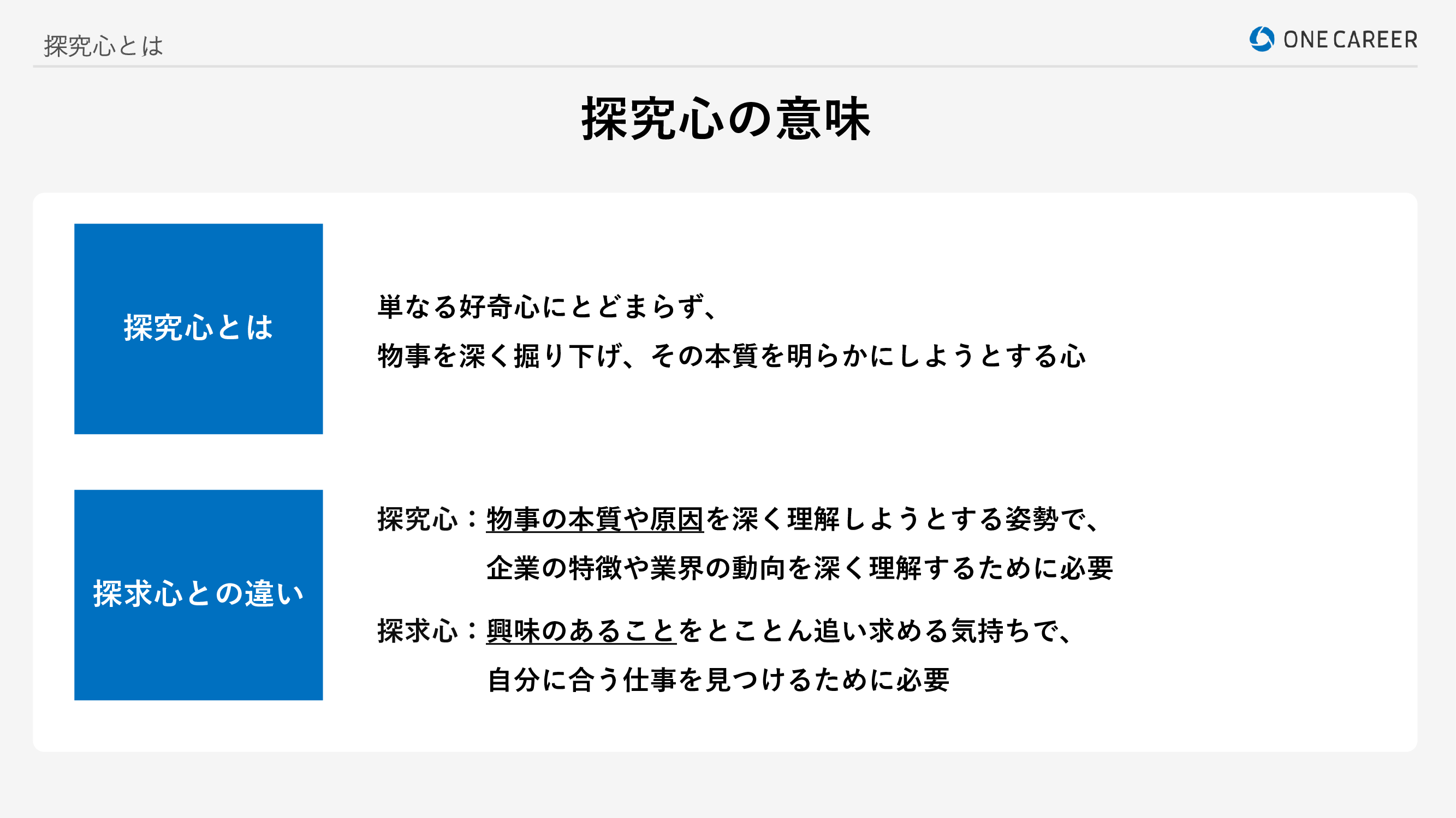 探究心とは、物事の本質を深く理解しようとする姿勢のことです。就職活動においては、業界や企業のことを徹底的に調べたり、仕事の意義を考えたりする力が求められます。