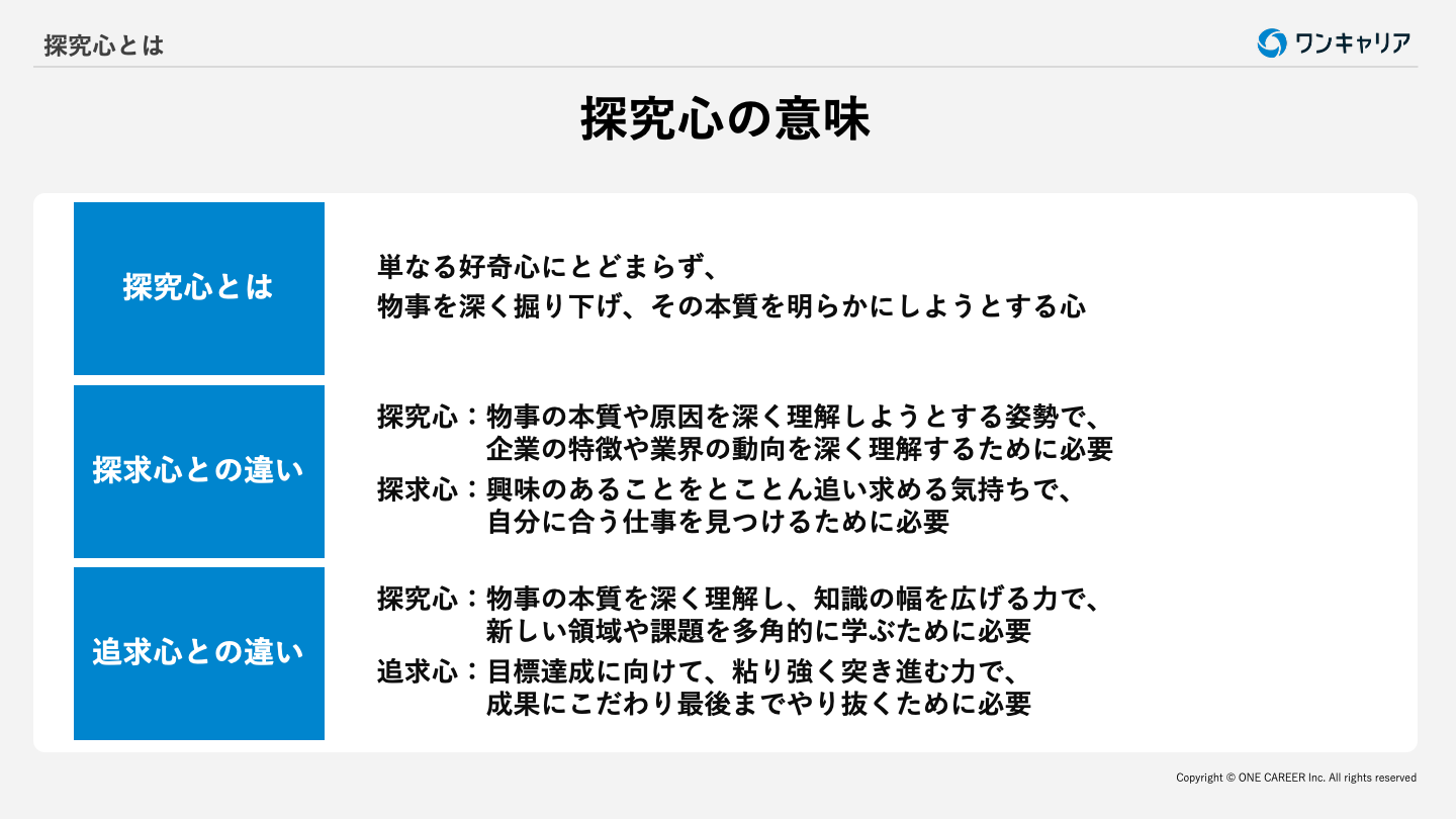 <目次> ●探究心とは? ·探究心の意味 ·探究心と探求心の違い ·探究心と追求心の違い ●探究心が強い人の特徴 ·新しいことを学ぶのが好き ·物事を深掘りして考える ·変化や新しい挑戦に前向き ·仮説を立てて自発的に行動する ·結果を出すことを意識して行動する ●企業が探究心を求める理由 ·チームでのリーダーシップが発揮できる ·専門領域に特化した人材の素質を持つ ·成長意欲が高い ·新しく斬新なアイデアを出す ●「探究心」の他に使える言い換え表現 ·知的好奇心 ·知識欲 ·向上心 ·忍耐力 ·他には? 探究心からの具体的な行動を言う ●探究心を効果的に自己PRするためのポイント ·経験で探究心が発揮されたシーンを具体的に説明する ·入社後の活躍イメージを具体化する ·企業の求める価値観やスキルと結びつける ●シーン別|探究心をアピールする例文5選 ·アルバイト ·海外留学 ·サークル・部活 ·長期インターンシップ ·ゼミ ●職種別|探究心をアピールする例文8選 ·技術・研究職 ·企画・マーケティング職 ·営業職 ·コンサルティング職 ●探究心をアピールする際の注意点 ·探究心の短所のイメージを出さない ·志望動機に関係ない文章を書かない ●探究心に関してよくある質問 ·探究心がある人が向いている仕事・適職は? ·探究心が短所として捉えられないようにするには? ·探究心をアピールする際、最も効果的なエピソードの選び方は? ●おわりに