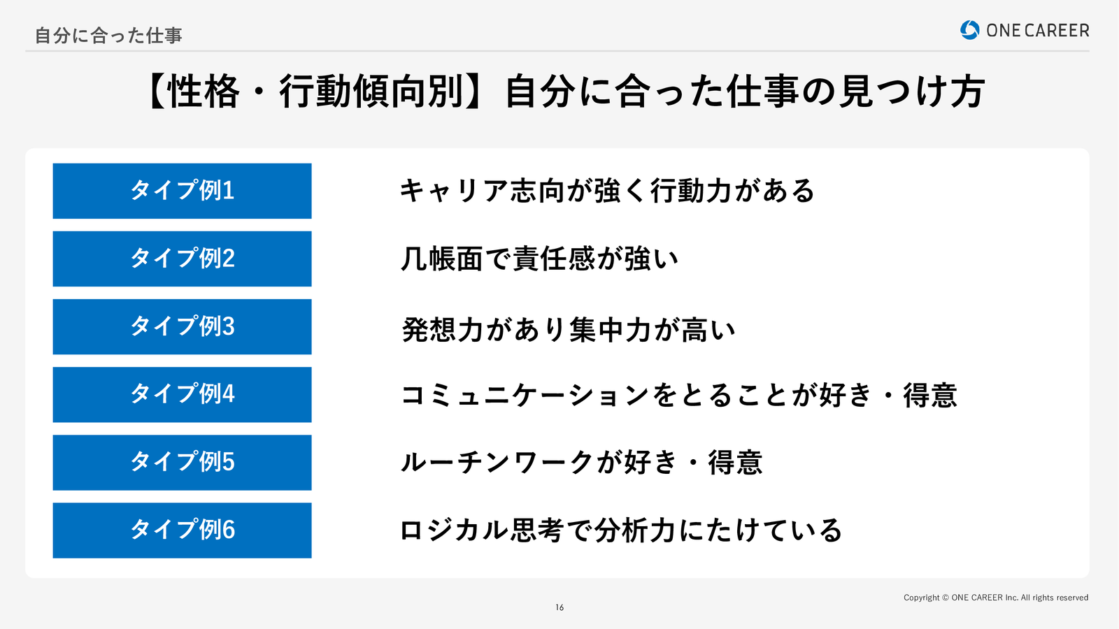 次に、性格・行動傾向別の自分に合った仕事の見つけ方を解説します。大きく6つのタイプに分けて解説します。