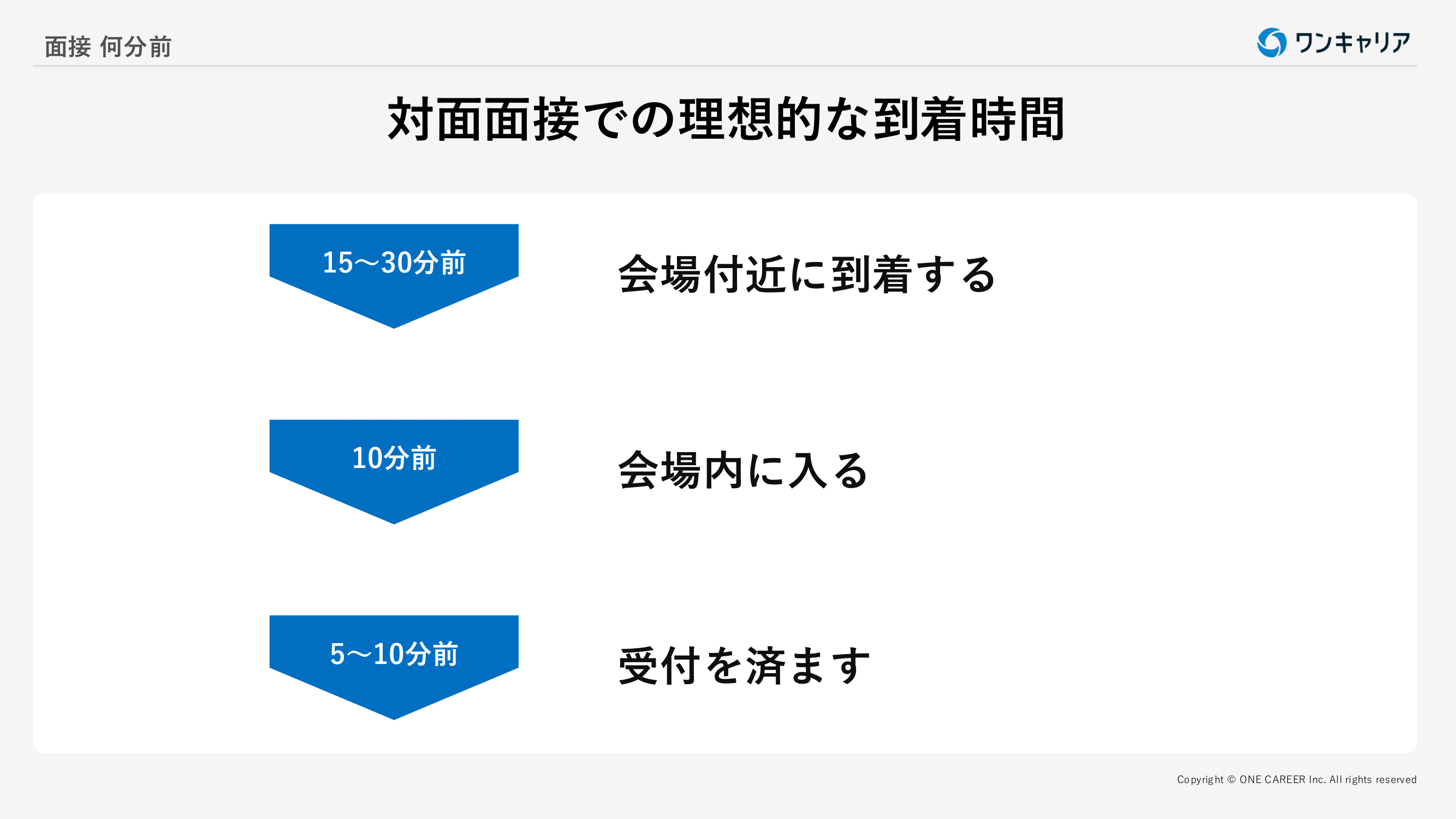 受付後、面接官が迎えに来るまで待機する時間があるため、早すぎる受付は避け、適切なタイミングを意識しましょう。