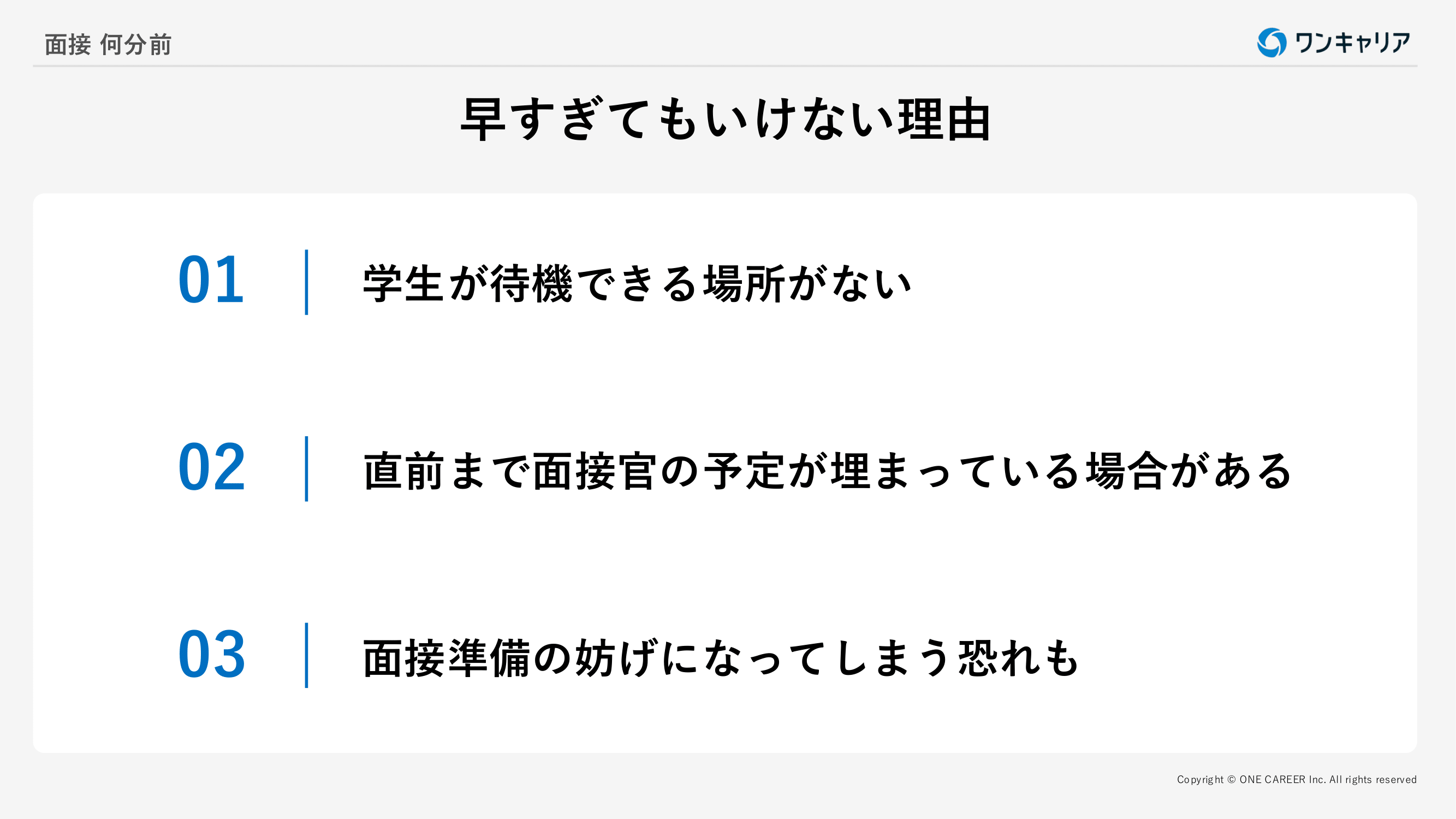 早く着きすぎると、企業側が待機場所を用意するために別のスペースを探す必要が出てくることもあり、結果的に迷惑をかけてしまう可能性があります。