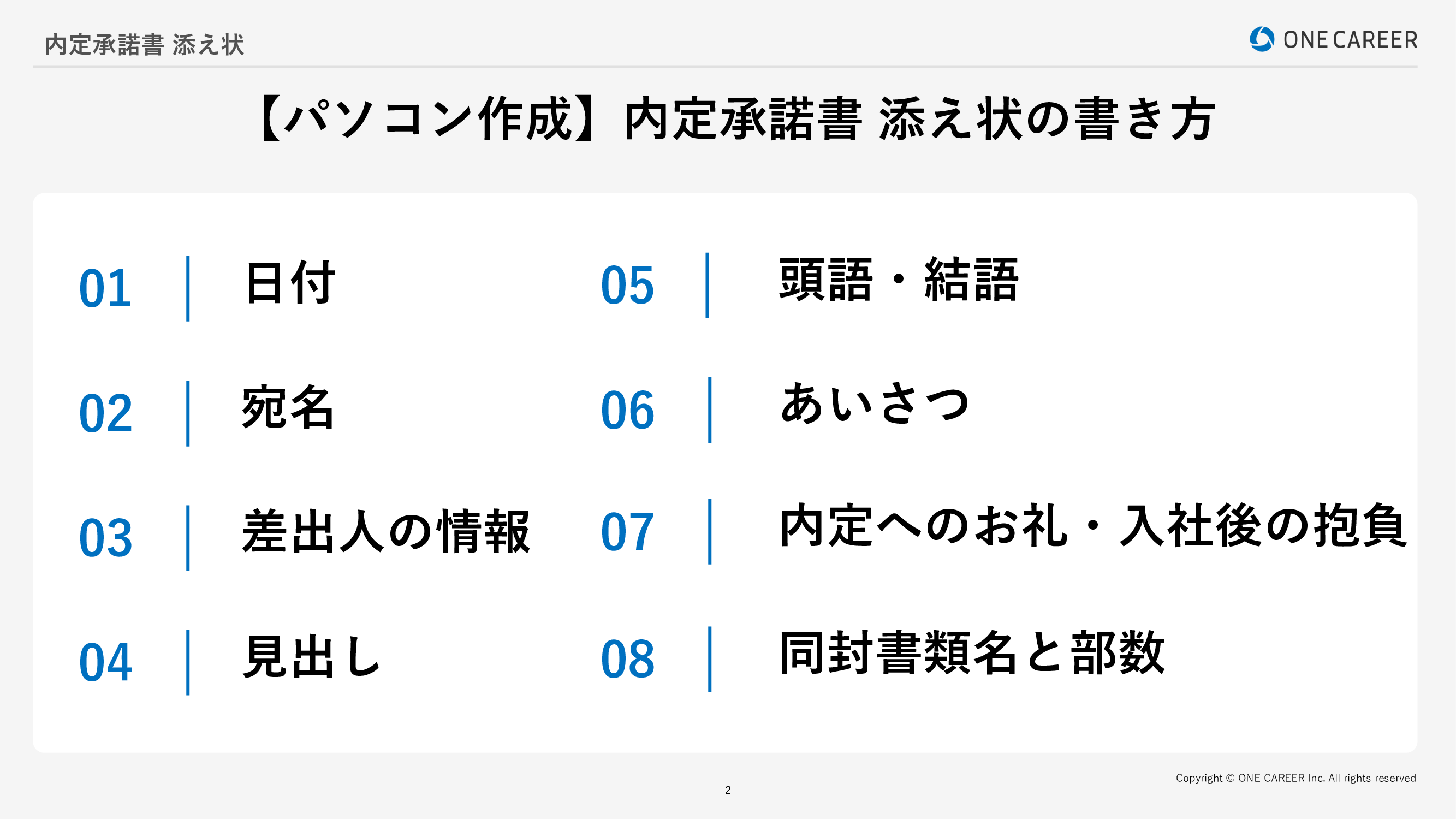 内定承諾書の添え状は、同封書類の概要を示すことが主な目的ですが、その他にも、内定をいただいたことへの感謝を伝えることも目的の1つです。