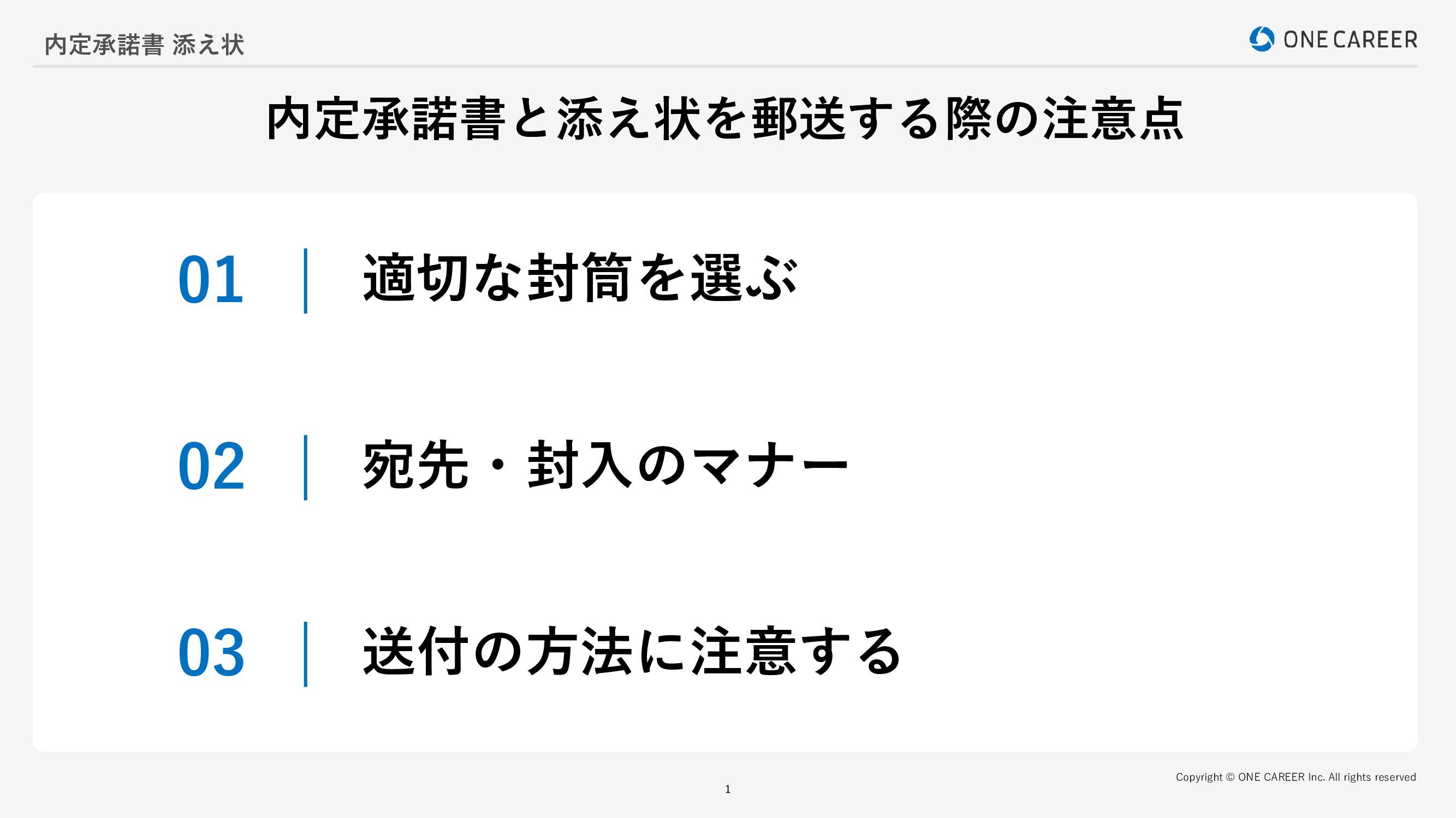 なお、書類を封入する際は、添え状を一番上にし、次に内定承諾書、その他の必要書類を重ねる順番にします。すべての書類をクリアファイルに入れ、折れや汚れを防ぐことも大切です。