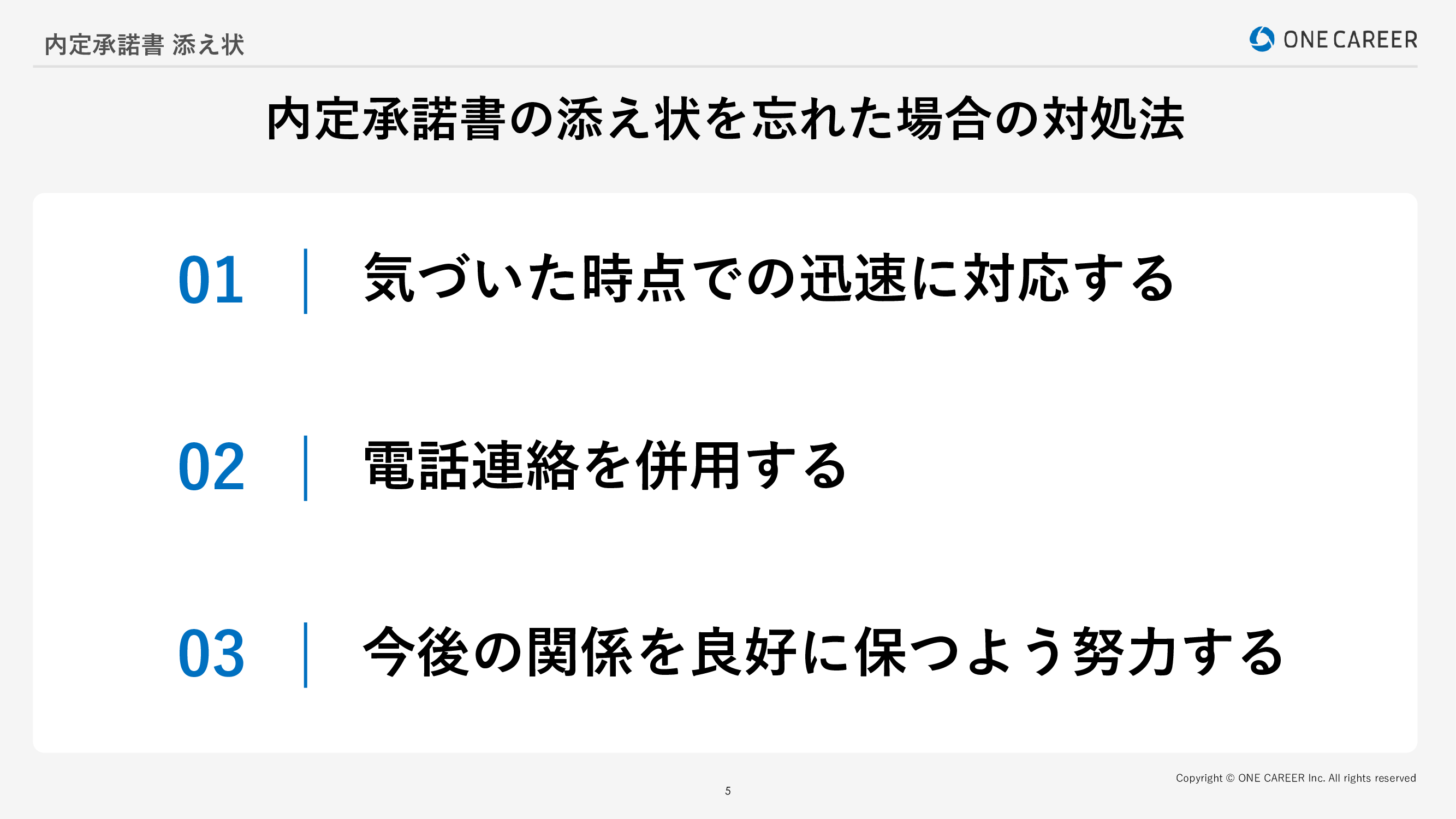 電話をする際は、「先日送付した内定承諾書について、添え状を同封し忘れました。大変申し訳ございません。別途お送りしてもよろしいでしょうか?」と簡潔に伝えると良いでしょう。