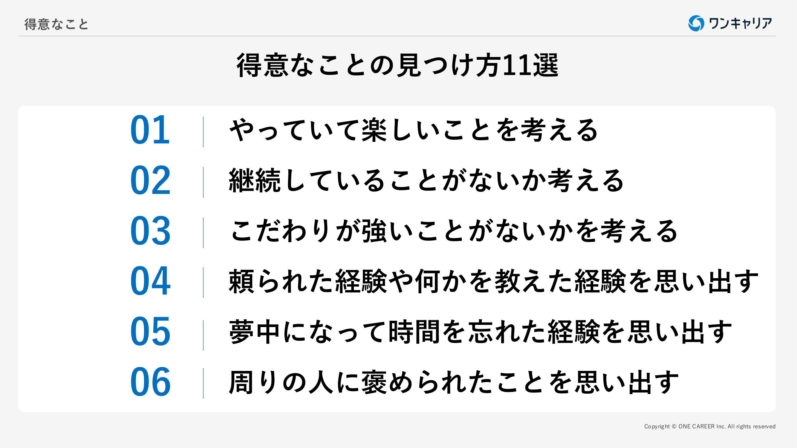 今回は、得意なことの見つけ方や面接での伝え方を解説しました。思い込みや比較が原因で得意なことが見つからないことは多々ありますが、今回解説した11の見つけ方を活用して、自分なりの「得意なこと」を見つけてみましょう。