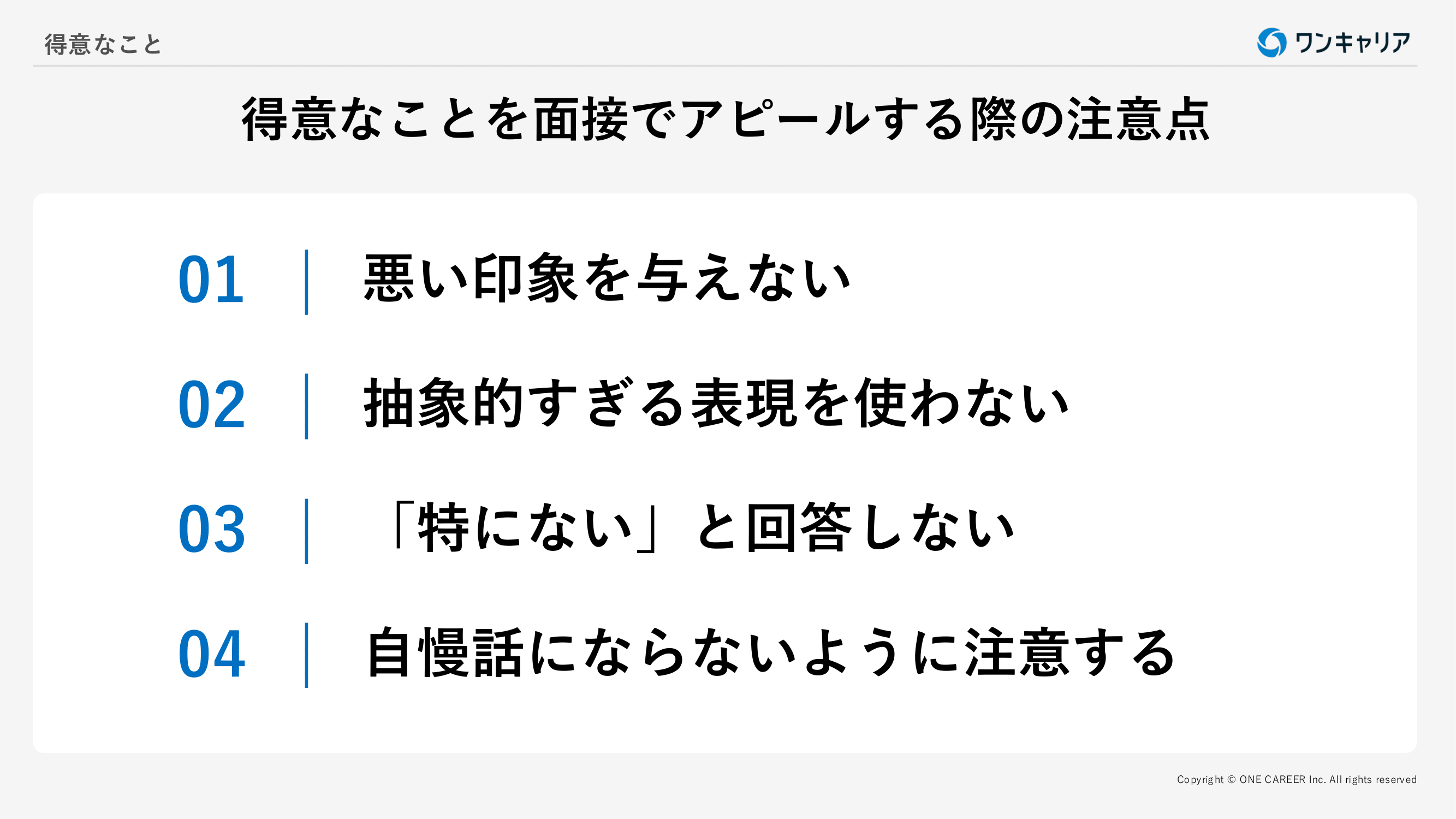 自分の得意なことを伝える際には、言い方や内容次第で印象が大きく変わります。ここでは、面接での伝え方で注意すべきポイントについて解説します。