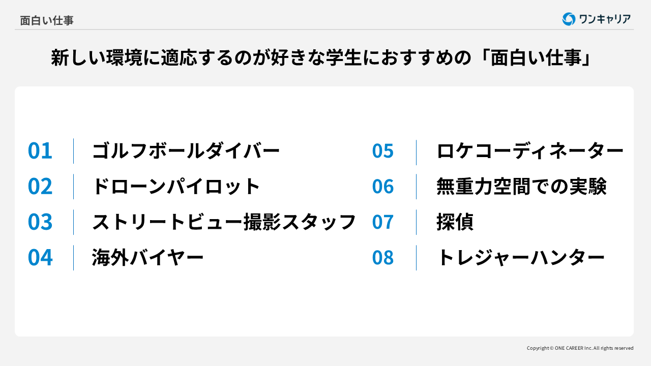 新しい環境に適応するのが好きな学生には、以下のような面白い仕事がおすすめです。