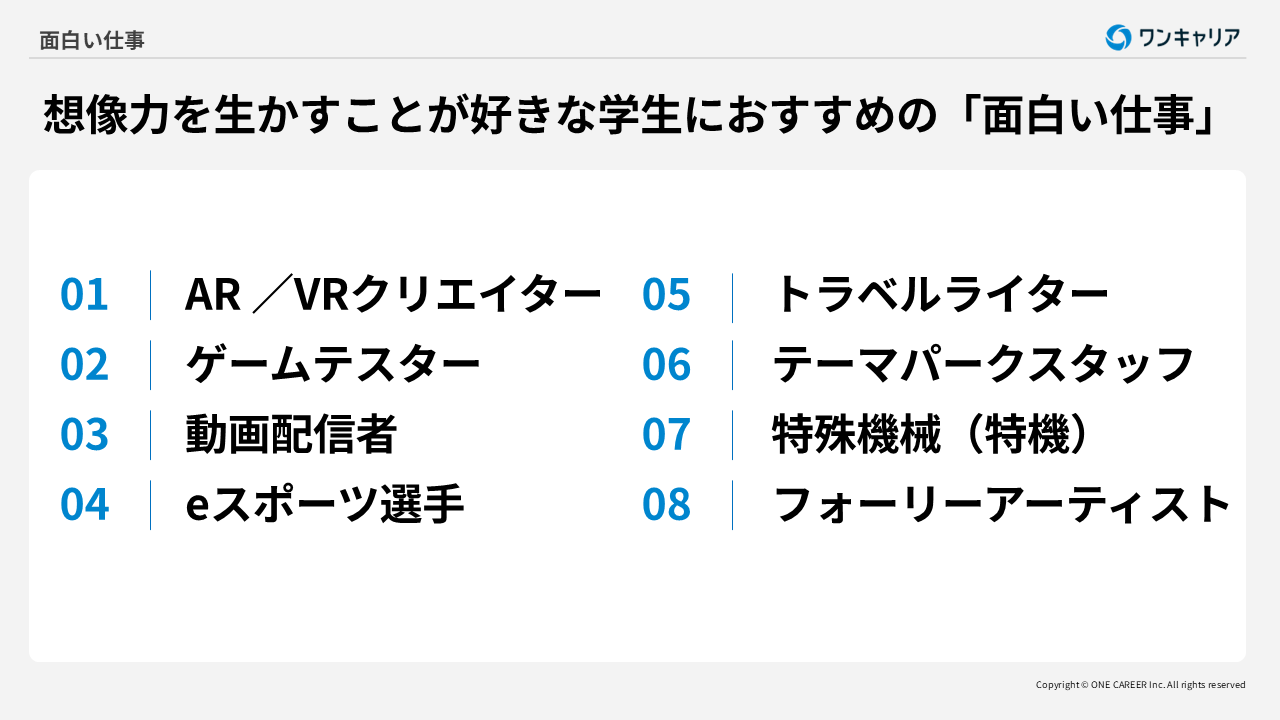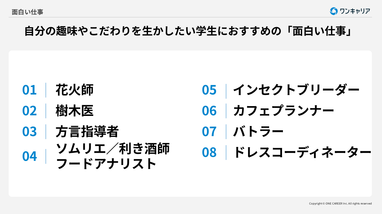 <目次> ●面白い仕事とは? ·仕事が「面白い」と「楽しい」は違う ·やりがいが面白さにつながる ●面白い仕事が見つけられる人の特徴 ·知的好奇心がある ·挑戦的である ·飽きがこない ●面白い仕事一覧30選 ·勉強好きで専門知識に挑戦したい学生におすすめ! ·新しい環境に適応するのが好きな学生におすすめ! ·想像力を生かすことが好きな学生におすすめ! ·自分の趣味やこだわりを生かしたい学生におすすめ! ●仕事で「面白い」と感じやすいポイント ·主体性を持って動ける ·労働環境や待遇条件に満足できる ·将来のキャリアプランを描きやすい ●自分にあった「面白い仕事」の探し方のコツ ·自己分析を活用する ·志望先と自分のマッチ度を確認する ·面白い仕事は意外と身近にある ●「面白い仕事」を探すときの注意点 ·仕事内容が自分に向いているかを検討する ·求人数や採用人数が少ないかもしれない ·「面白い仕事」でも資格や経験が必要な場合がある ●「面白い仕事」に実際に就くためには? ·幅広くエントリーする ·資格を取得する ·長期的なキャリアプランを立てる ●「面白い仕事」に就くメリット ·仕事にやりがいを持てる ·希少な人材として市場価値が高まる ·自身の強みや個性を発揮できる ●「面白い仕事」に関するよくある質問(FAQ) ·面白い仕事は未経験や文系からでも挑戦できる? ·面白い仕事に将来性や安定性はある? ·一般的な求人サイトに載っていない場合はどう探す? ●おわりに