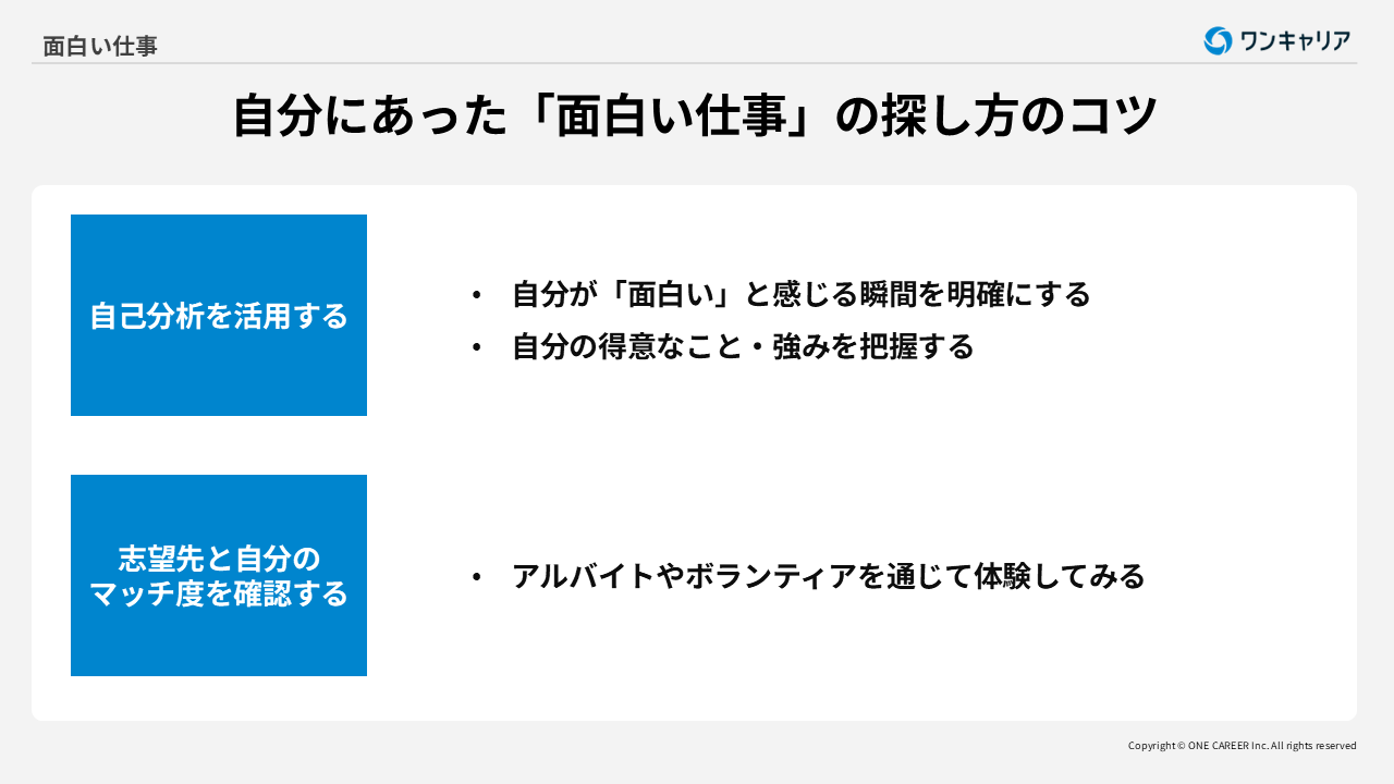自己分析をする中でも、特に以下の2つのことを心がけて進めることで、「自分に合った面白い仕事」がより具体的に見えてきます。