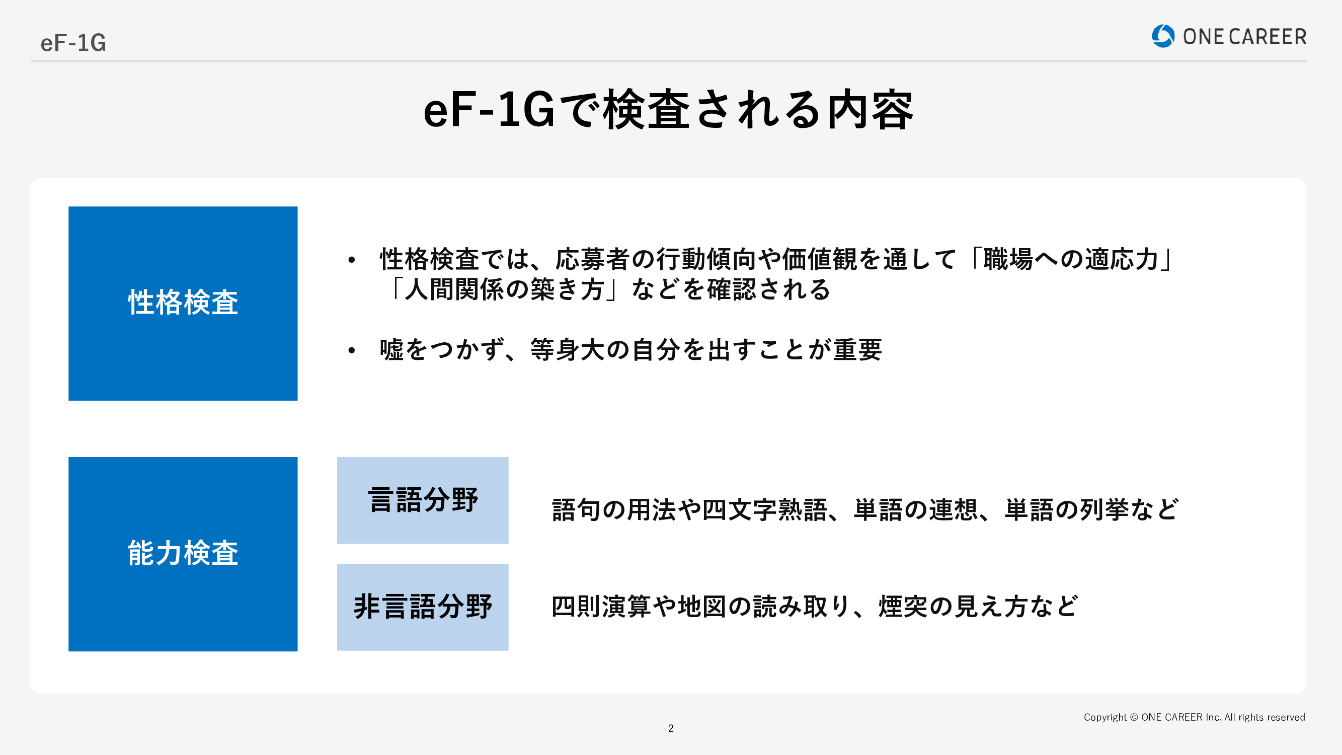 eF-1Gは、大きく「性格検査」「能力検査」の2つで構成されています。