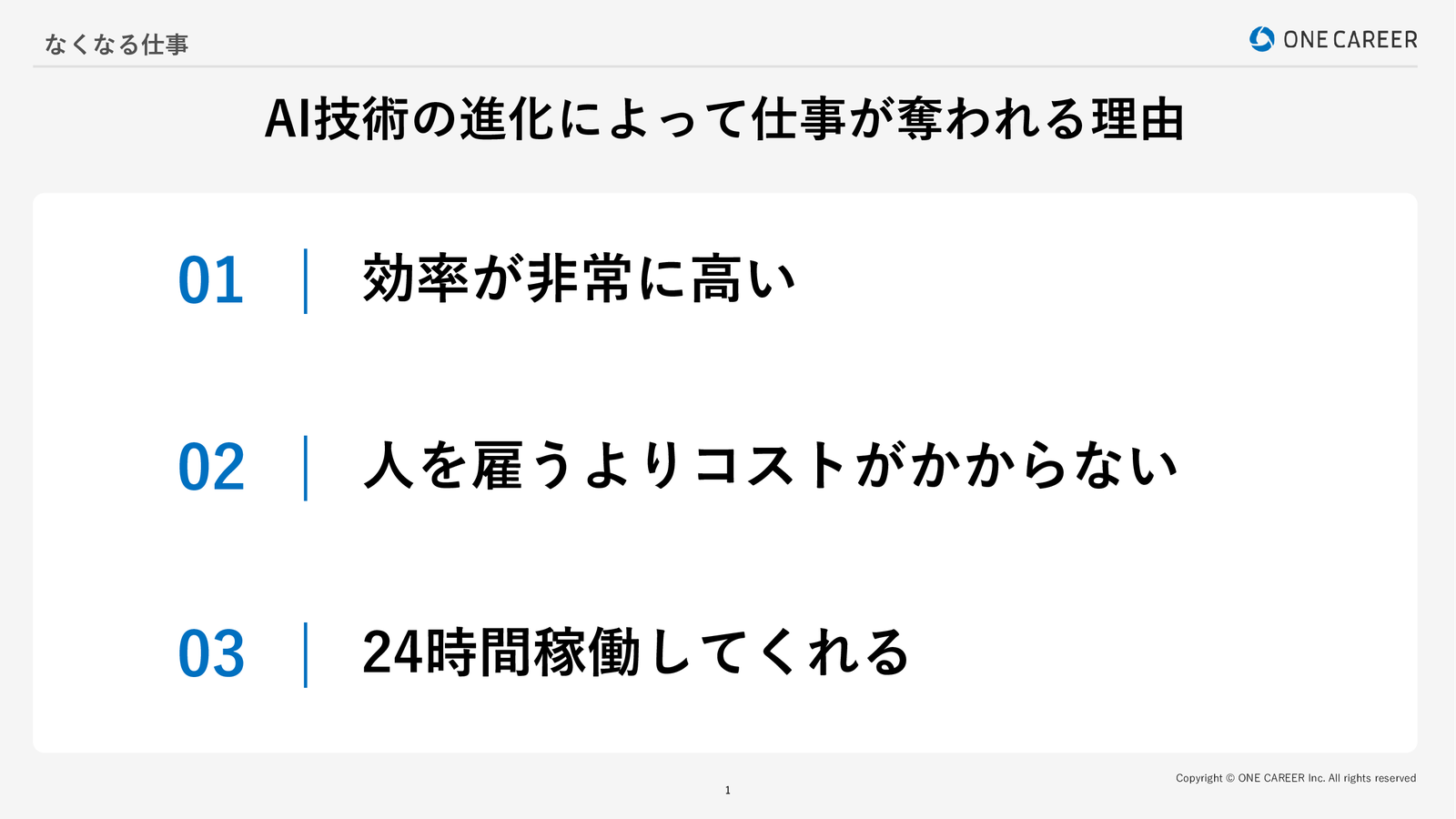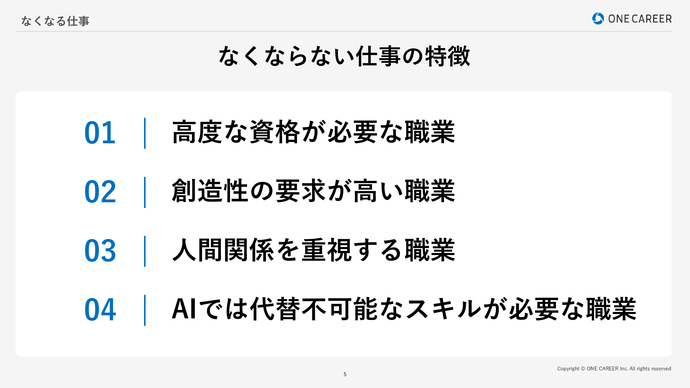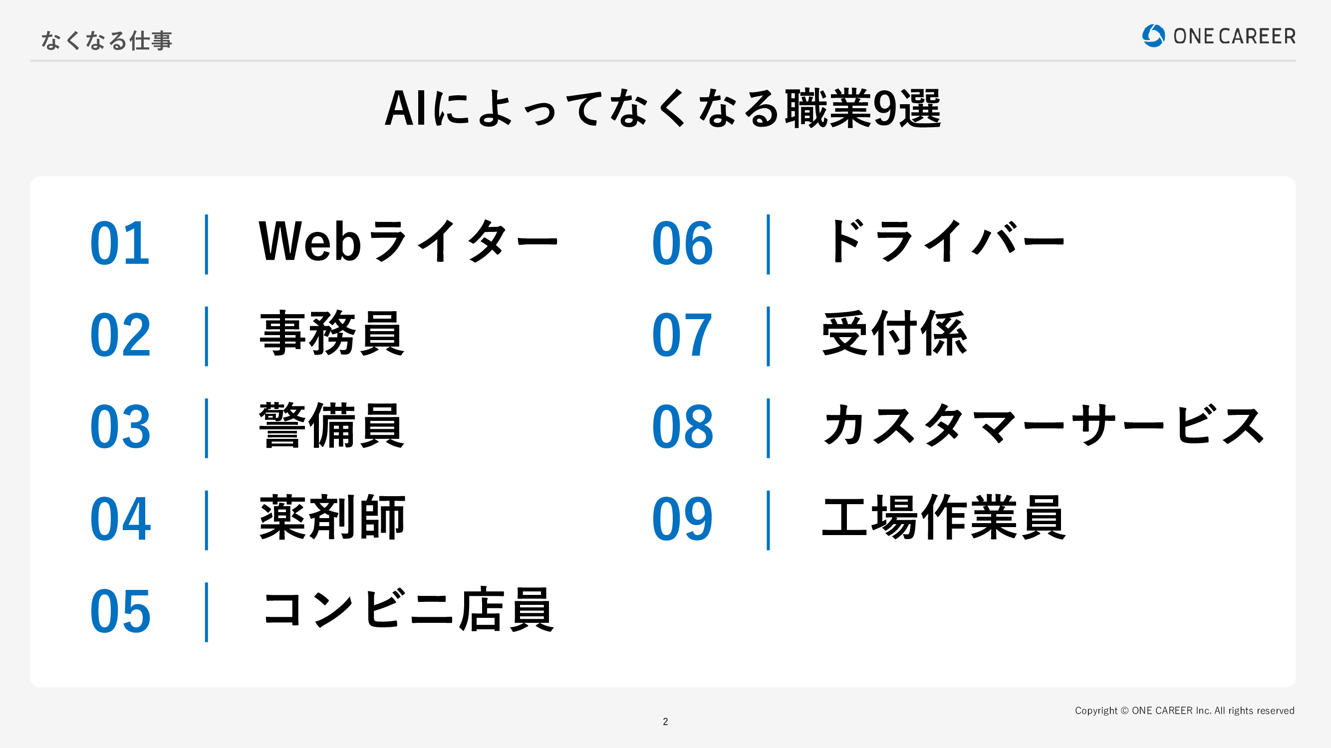 このように、ルーチンワークが中心の職種ほど、AIによる代替が進み、今後なくなる可能性が高いと考えられます。