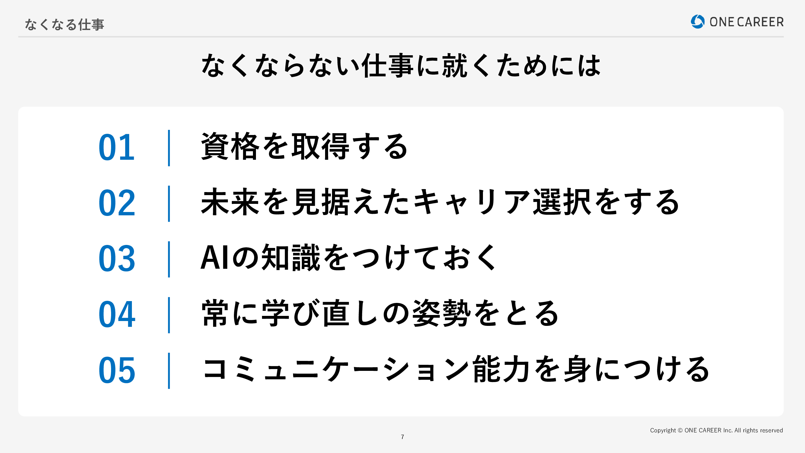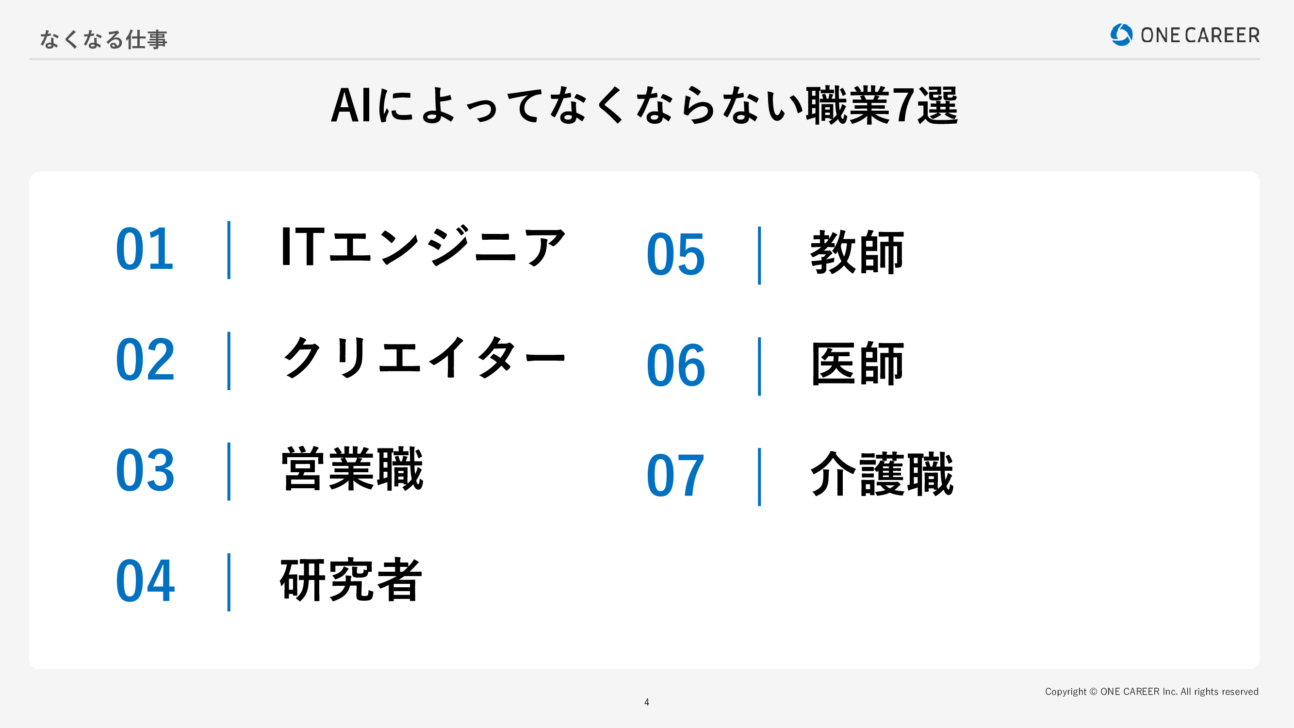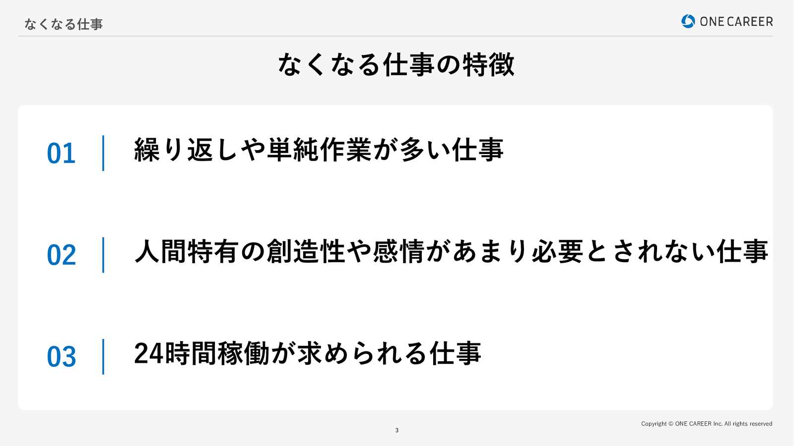 このように、ルーチンワークが中心の職種ほど、AIによる代替が進み、今後なくなる可能性が高いと考えられます。