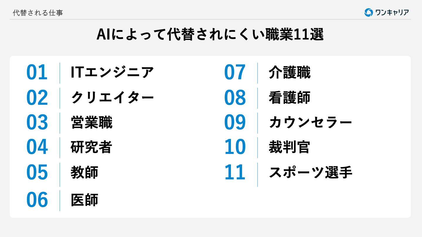 創造性が問われる職業では、人の感性や経験が価値として求められるため、今後もAIに仕事を奪われにくい領域といえるでしょう。