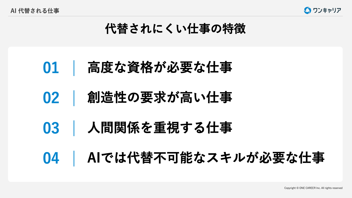 AIに代替されにくい仕事には、一定の共通点があります。これからの時代に強い仕事の特徴を押さえておきましょう。