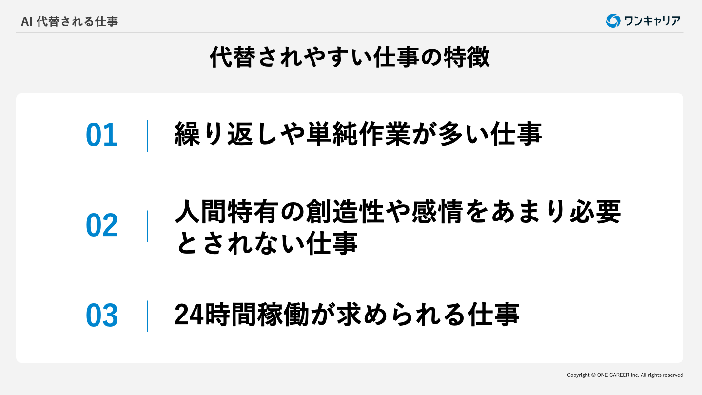AIに置き換わりやすい仕事には共通の特徴があります。どのような仕事がリスクにさらされやすいのかを具体的に見ていきましょう。
