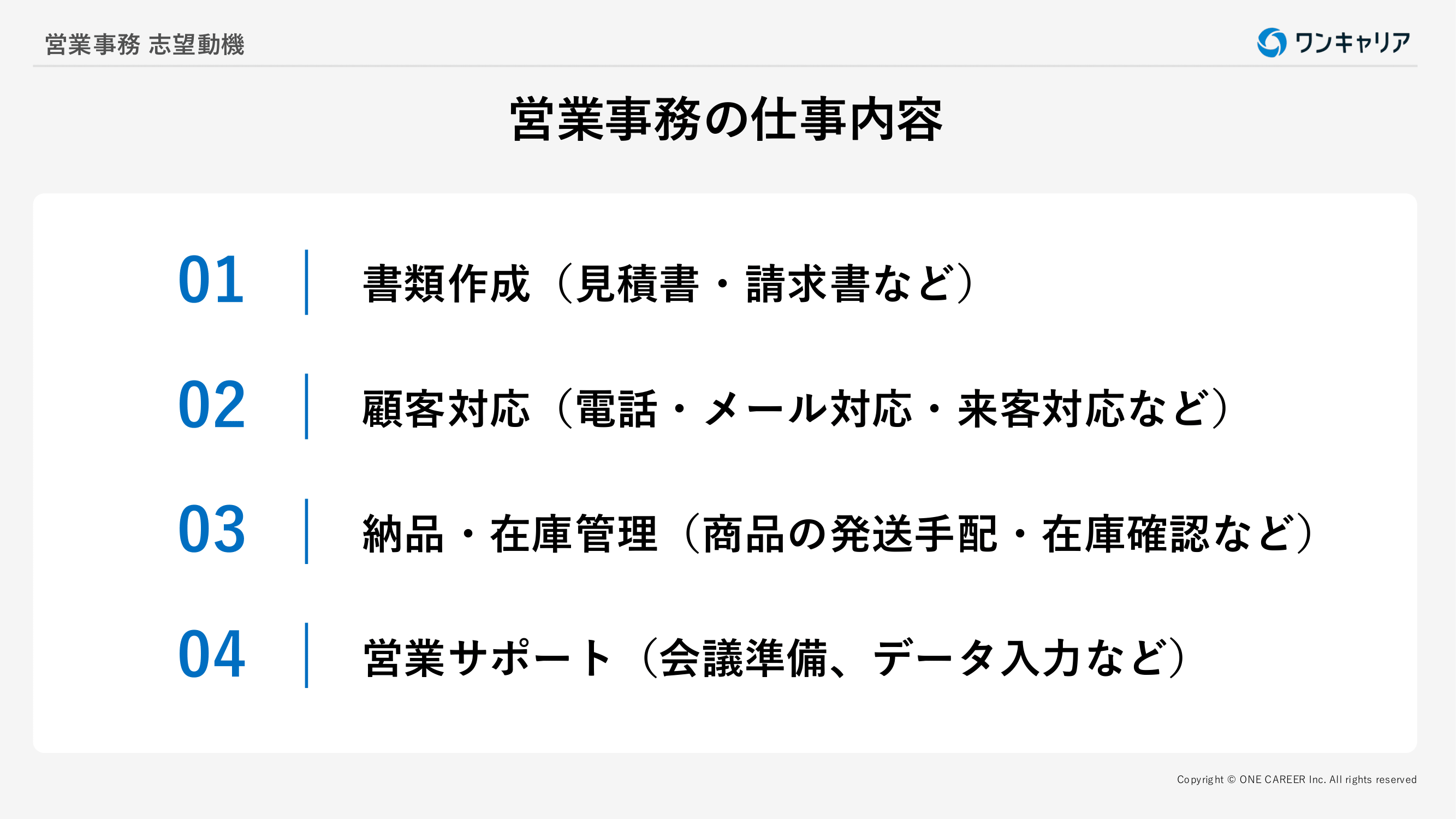 <目次> ●営業事務とは? ・営業事務の仕事内容 ・営業事務の魅力ややりがい ・営業職との違い ・一般事務との違い ●営業事務の志望動機の書き方 ・1. 結論 ・2. 背景や具体的なエピソード ・3. 入社後の意気込み ●営業事務の志望動機を作成する際のポイント ・営業事務を志望する理由を明確にする ・応募先企業を志望する理由を明確にする ・営業事務に生かせるスキルや強みをアピールする ●営業事務の志望動機の例文 ●営業事務に求められる能力 ・事務処理能力 ・パソコンスキル ・コミュニケーションスキル ・タスク管理スキル ・臨機応変な対応力 ●営業事務に向いている人 ・ホスピタリティが高い ・資料作成が得意 ・チームで仕事をするのが好き ●おわりに