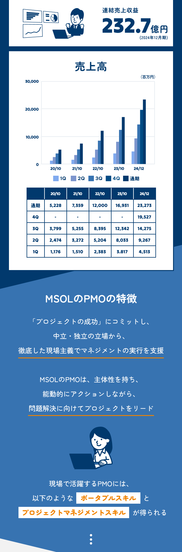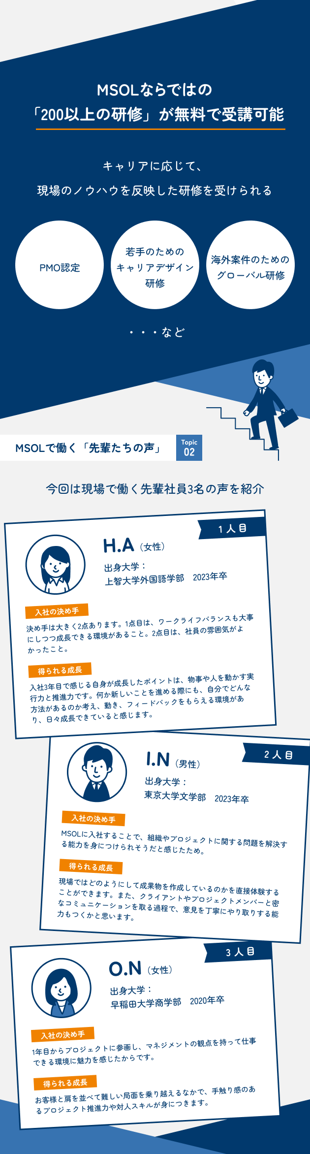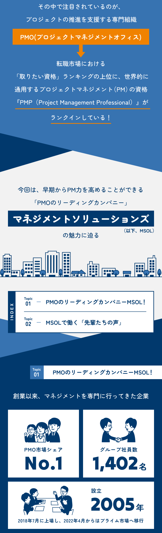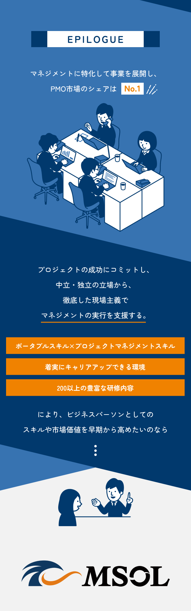 株式会社マネジメントソリューションズ(以下、MSOL)は、PMOの専門家集団として業界No.1の実績を持ち、若手のうちから現場でマネジメントを担える環境が整っています。