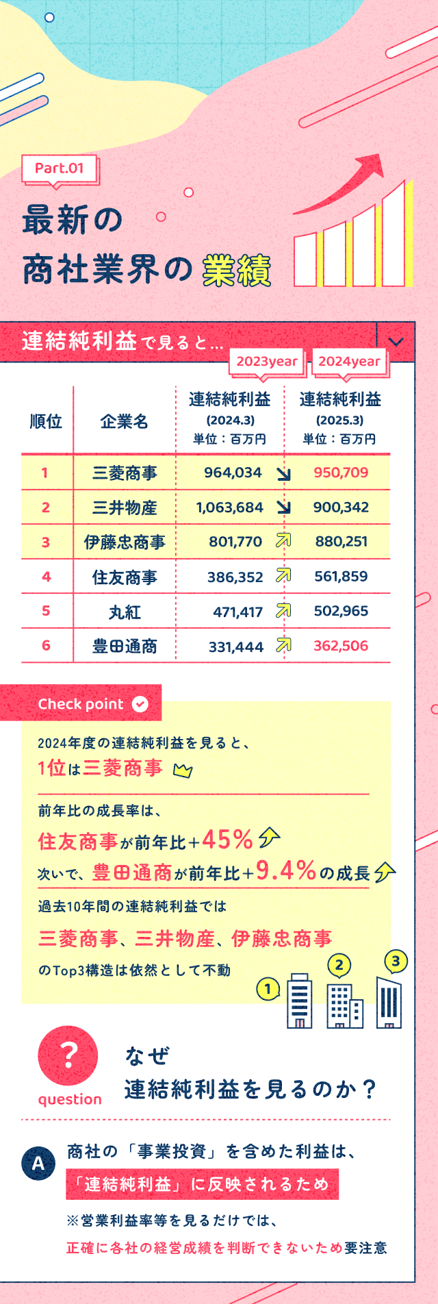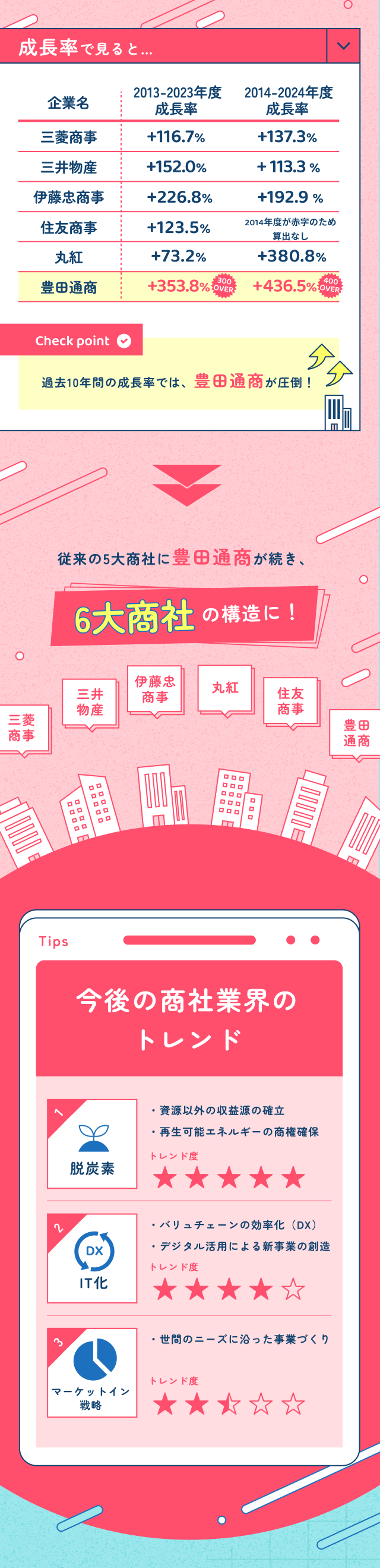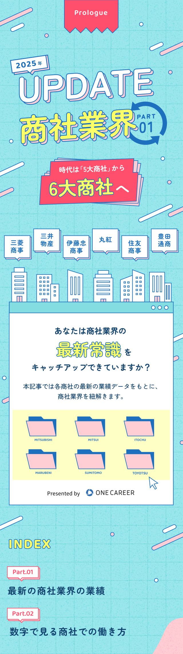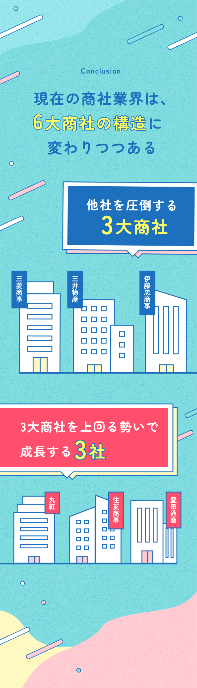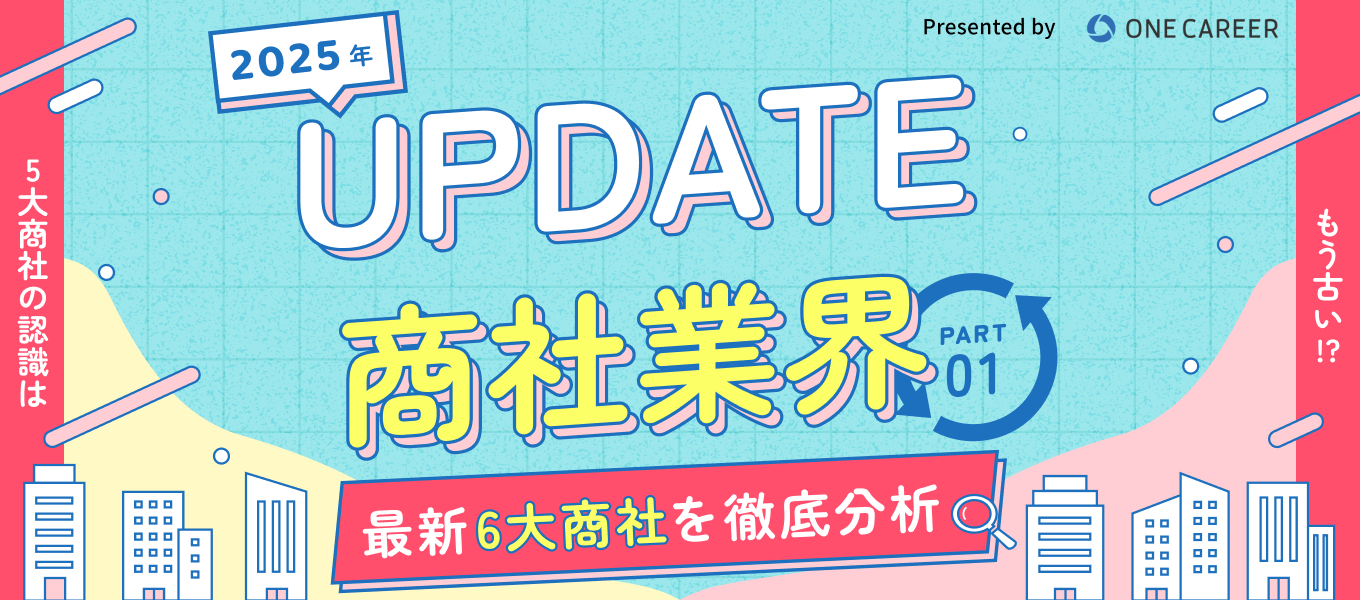 【2025年度版UPDATE商社業界】「5大商社」の認識はもう古い!? 最新「6大商社」を徹底分析 業界理解 企業理解 商社 日系 2025年6月23日(月) | 4,070 views sponsored by 豊田通商 商社業界の最新常識、アップデートできていますか? 本記事では各商社の最新業績データを元に、商社業界を紐解きます。 【デザイン::株式会社caroa/編集:鈴木 崚太】 この記事が気に入ったらいいね!しよう ワンキャリアの人気記事をお届けします。 Facebook Twitter 公式アカウント ワンキャリ編集部 はじめてのキャリアを選ぶ、就活サイト「ワンキャリア」の編集チーム。 ▼公式X/Facebook https://x.com/onecareerjp https://www.facebook.com/onecareer.jp/ @onecareerjp をフォロー