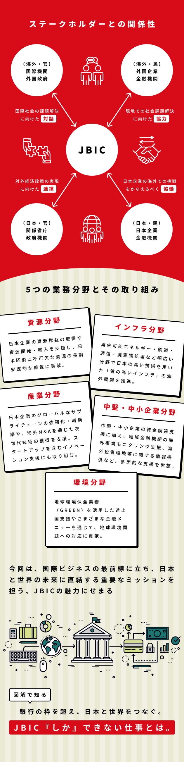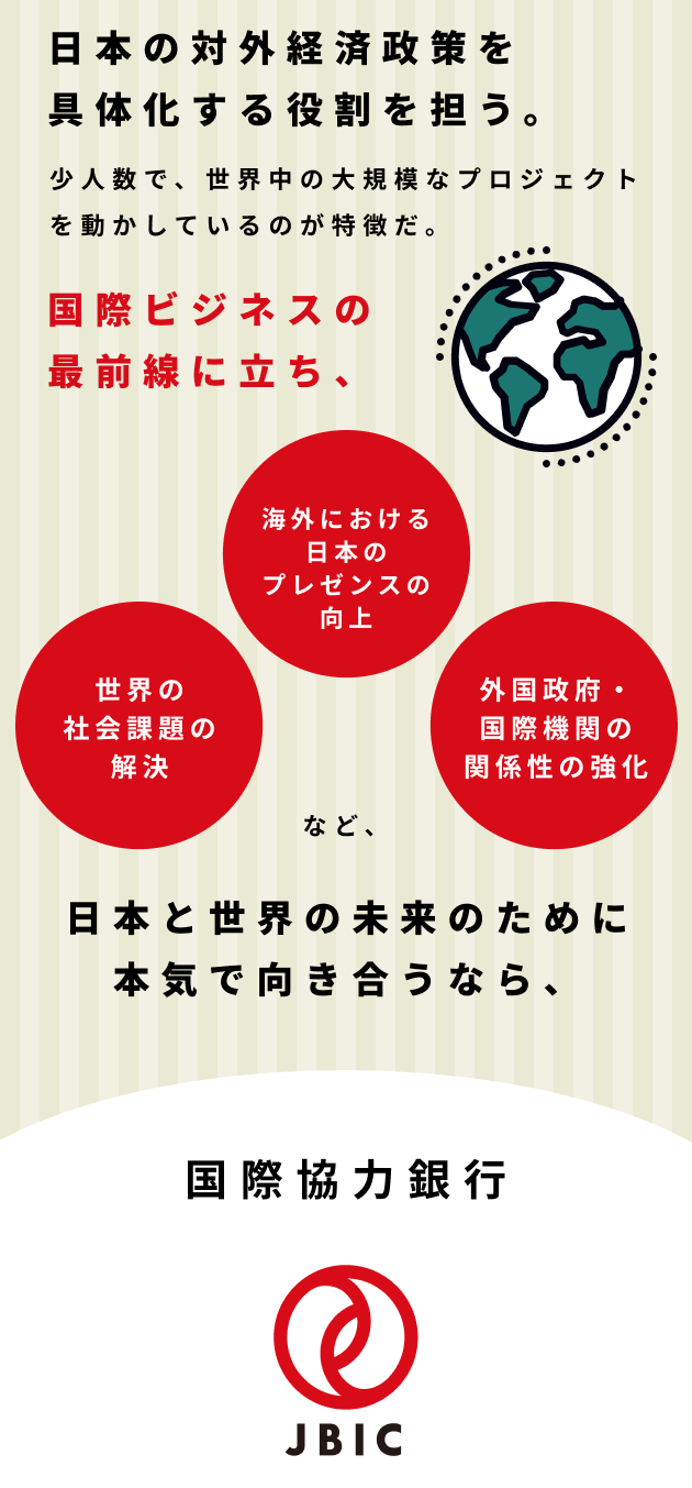 本記事では、国際ビジネスの最前線で、日本と世界の未来を支えるJBICの魅力にせまります。