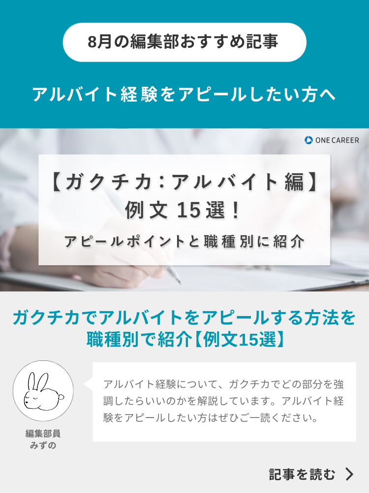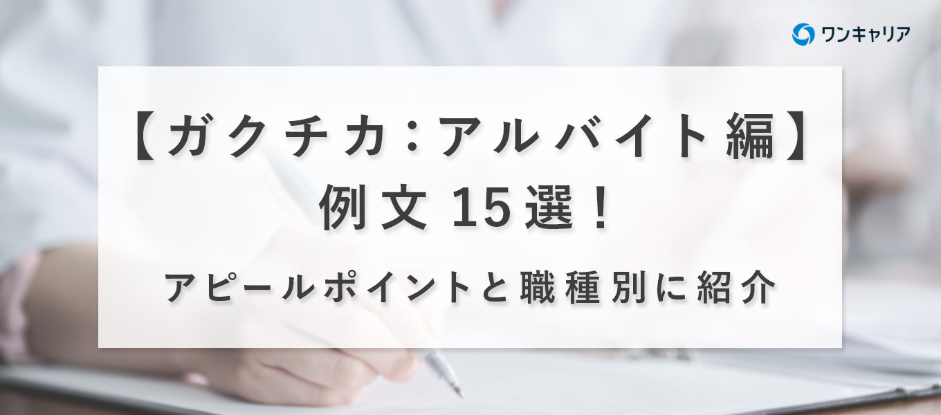 ガクチカで企業が評価するポイントから、アルバイト経験を効果的にアピールする方法を職種別の例文とともにご紹介していますのでぜひご一読ください!
