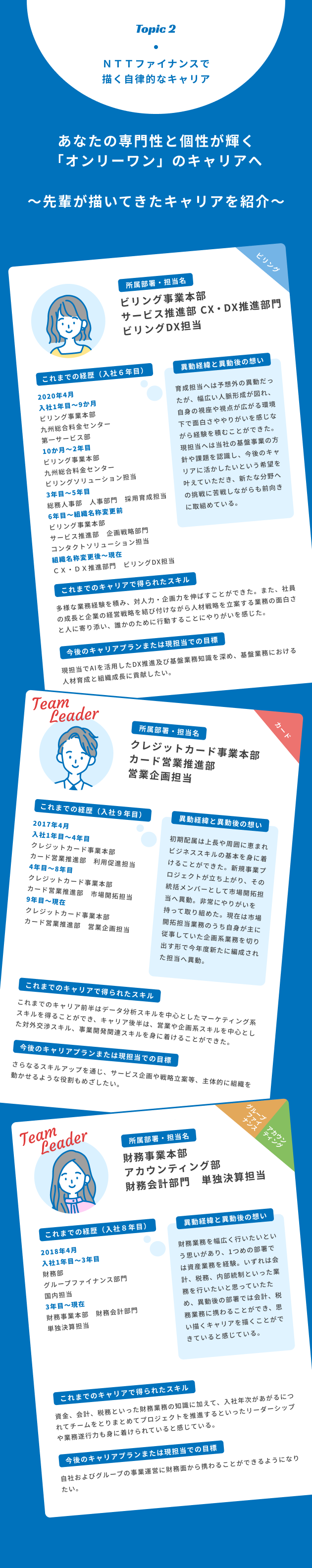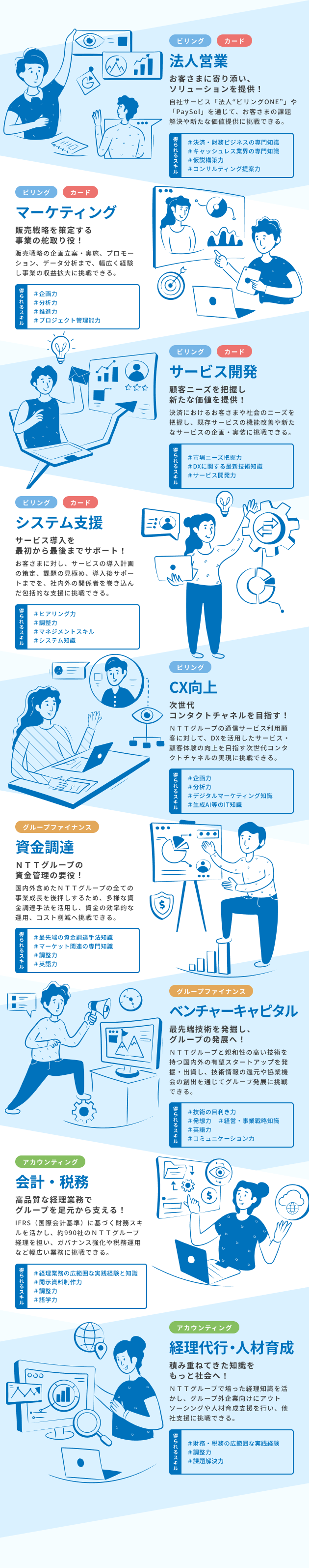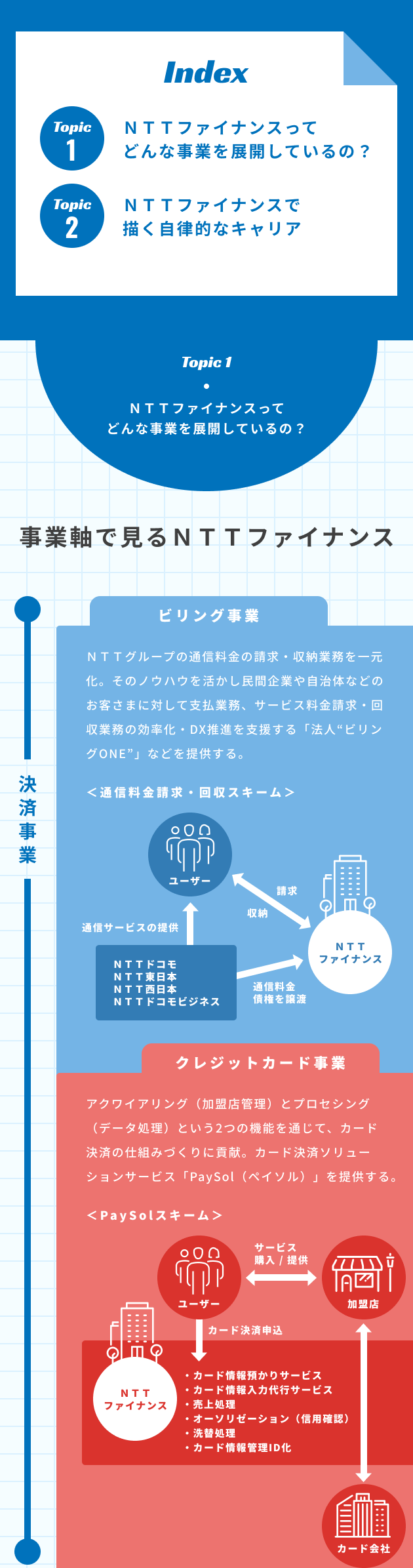 ビリング、クレジットカード、グループファイナンス、アカウンティングの4つの事業を通じ、豊かな社会づくりに貢献しています。スケールの大きな事業基盤を舞台に様々な挑戦をしており、学生が想像する以上の幅広いキャリア可能性に出会えます。