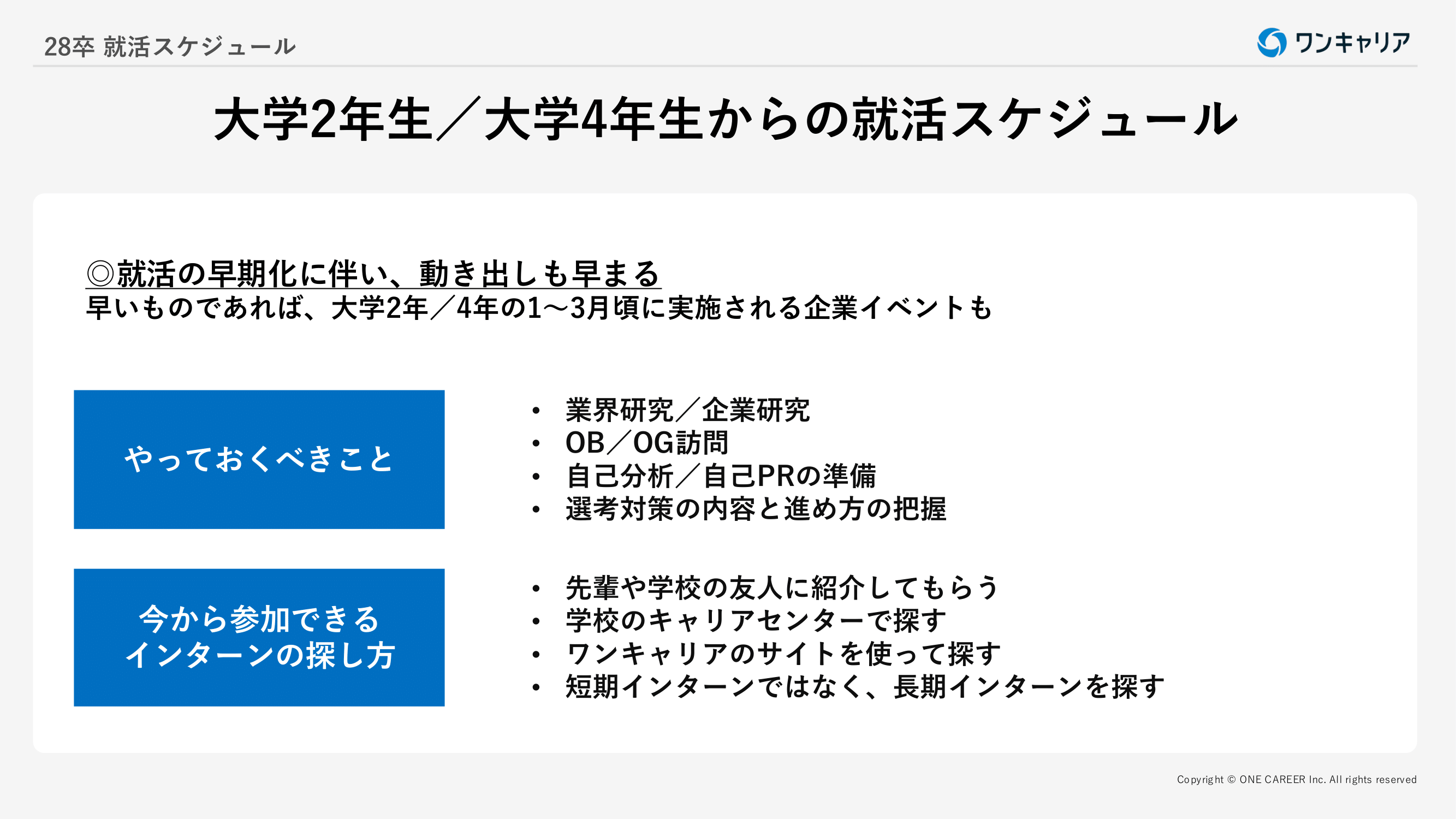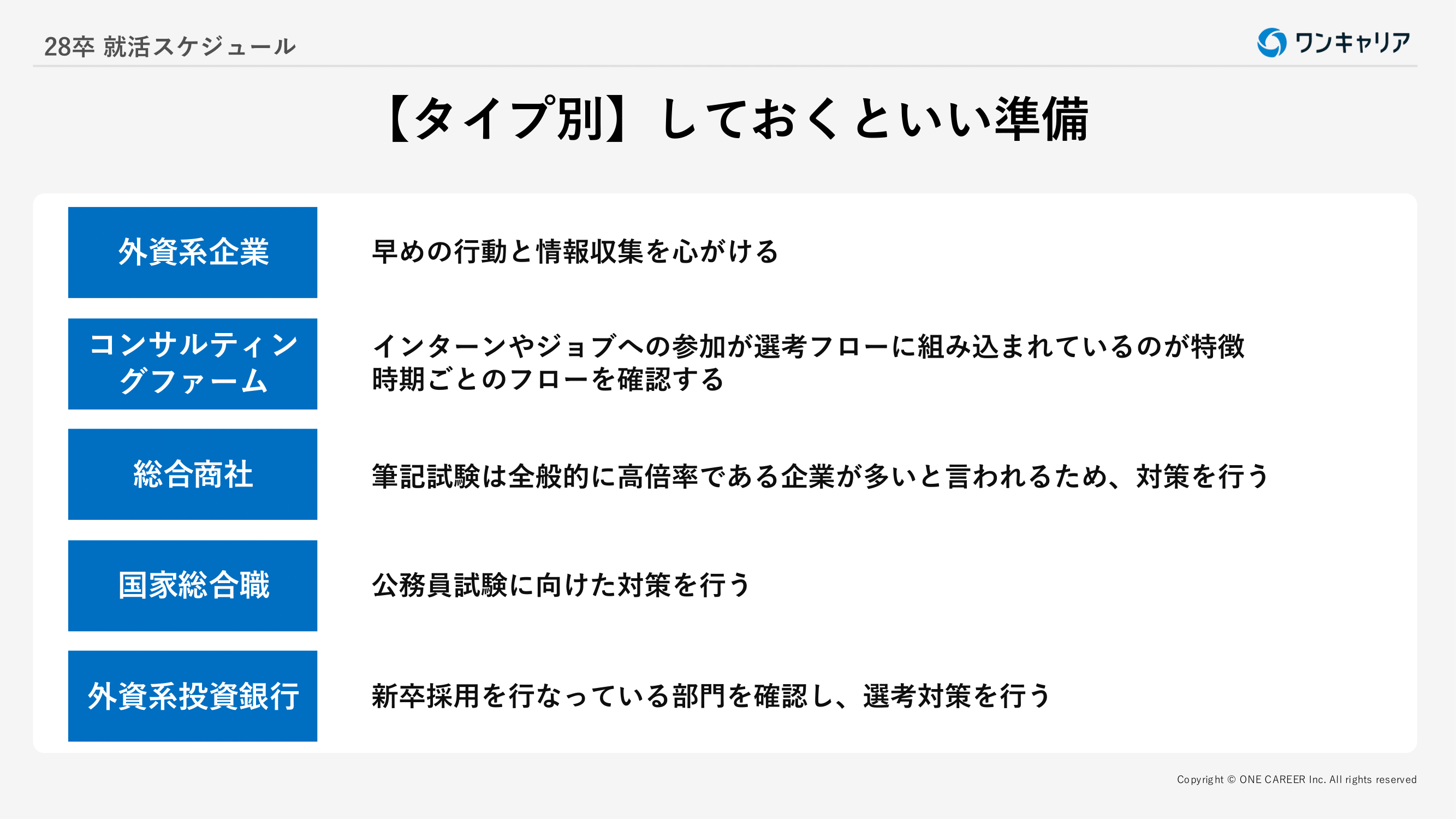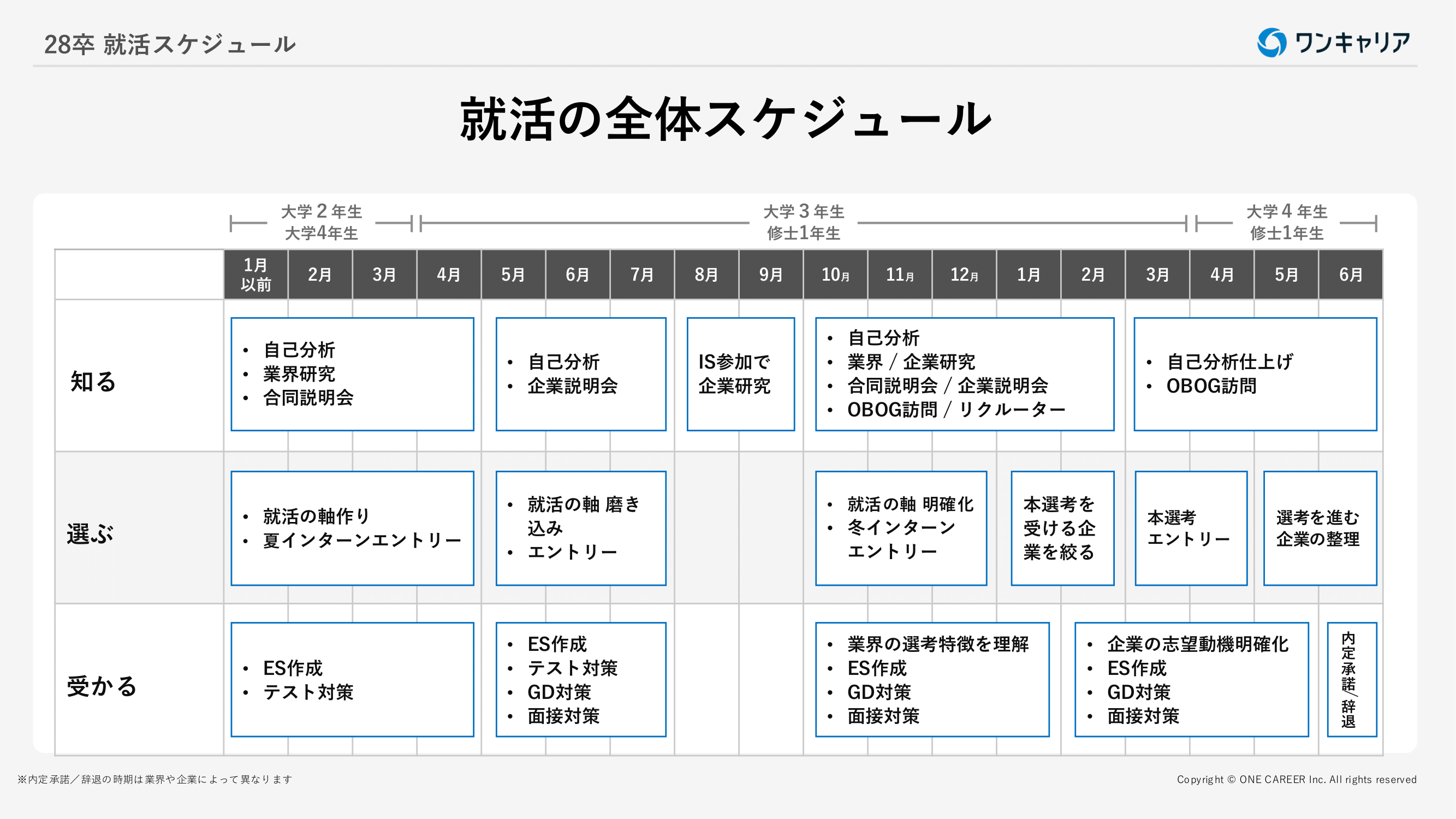 <目次> ●2028年卒とは何年生? ●28卒就活のスケジュール ・大学3年生/修士1年生からの就活スケジュール ・大学2年生/大学4年生からの就活スケジュール ●【28卒】新卒採用市場の動向 ・新卒採用ニーズが多いため、学生には追い風 ・大手企業への就職は難しい ・早期に採用選考をする企業が増えている ・採用形式の多様化 ●企業の選考スタート時期と内定が出るタイミング ・【8月〜1月】外資系企業の選考スケジュール(BCG、アクセンチュア、P&G Japan、モルガン・スタンレー) ・【11月〜2月】ベンチャー/メガベンチャーのスケジュール(サイバーエージェント、Visional(ビズリーチ)) ・【10月〜5月】その他の日系大手企業のスケジュール ●就活を有利に進めるためのポイント ・就活早期スタートのメリット ・企業が求める人材を把握する ・インターンの重要性と内定との関係性 ・ワンキャリアスカウトに登録する ●【全員共通】今からできる準備 ・業界研究/企業研究 ・OB・OG訪問 ・説明会に参加する ・自己分析/自己PRの準備 ・選考対策の内容と進め方の把握 ●【タイプ別】しておくといい準備 ・外資系企業を目指す人向けの準備 ・コンサルティングファームを目指す人向けの準備 ・総合商社を目指す人向けの準備 ・国家総合職を目指す人向けの準備 ・外資系投資銀行を目指す人向けの準備 ●28卒就活についてよくある質問 ・「早期選考」って何? ・やりたい仕事は明確に決めておくべきか? ・内定はいつ頃までにもらえる? ・就活のために特別な経験を積む必要があるか? ・就活でまずやるべきことは? ・大学院に進学予定の場合は就活はいつ始めればいいの? ・就活にAIを使ってはいけない? ●おわりに