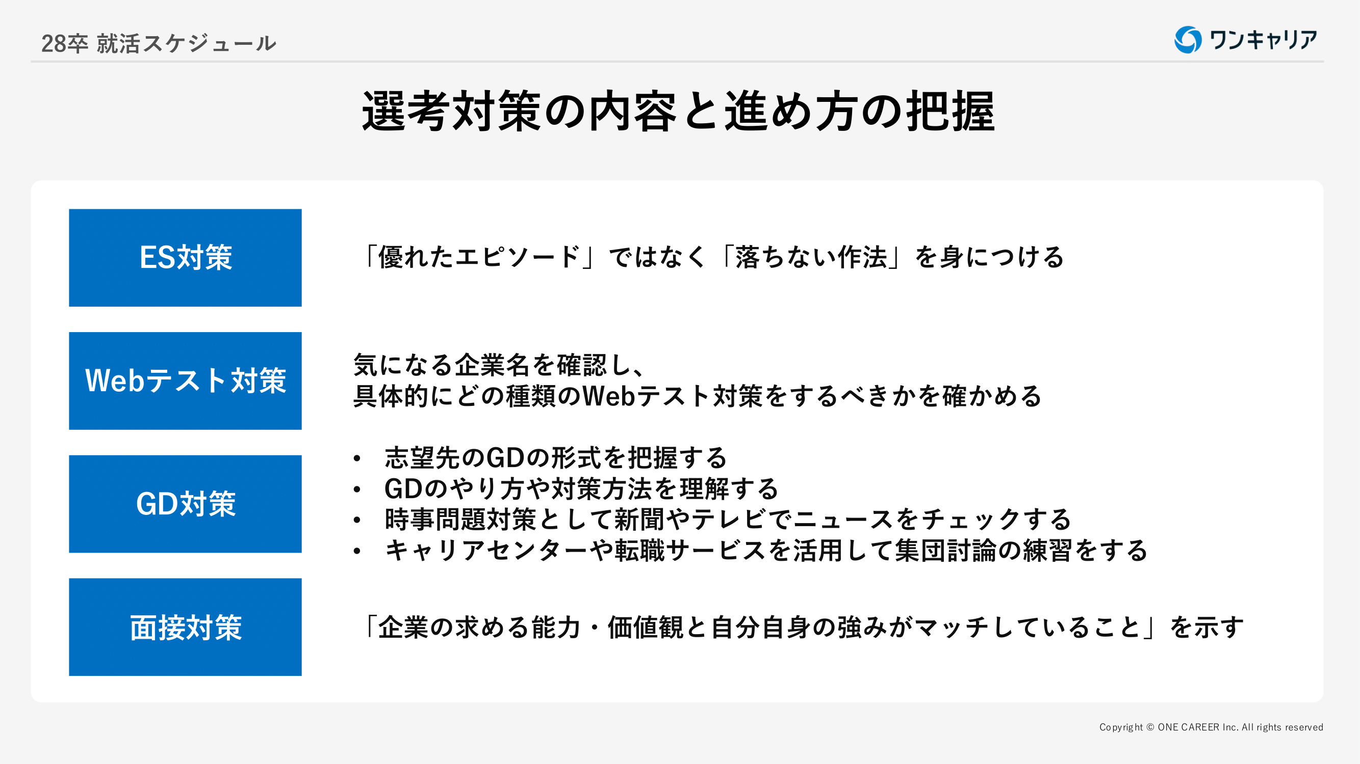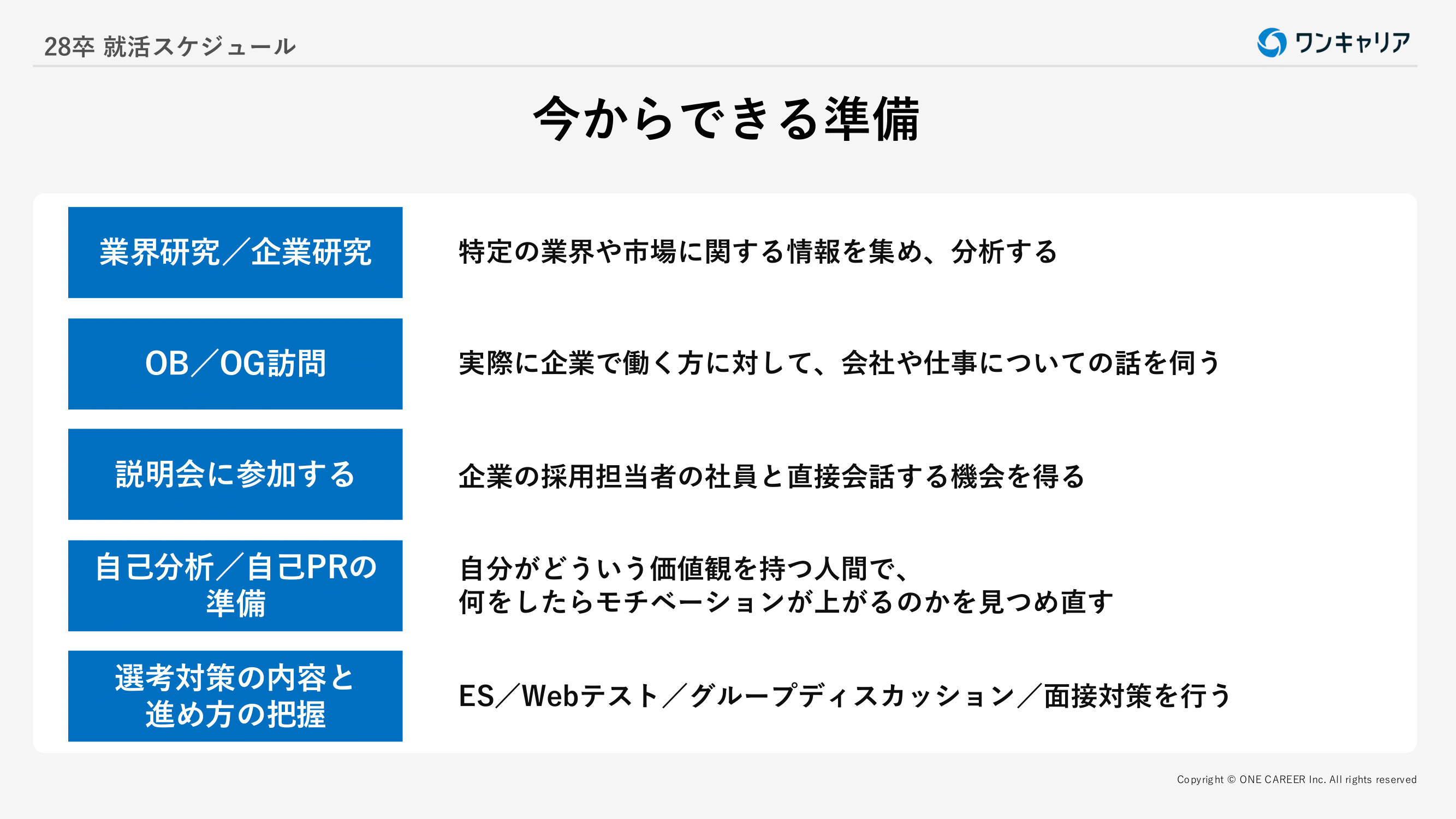 ・業界研究/企業研究 ・OB・OG訪問 ・自己分析/自己PRの準備 ・選考対策の内容と進め方の把握