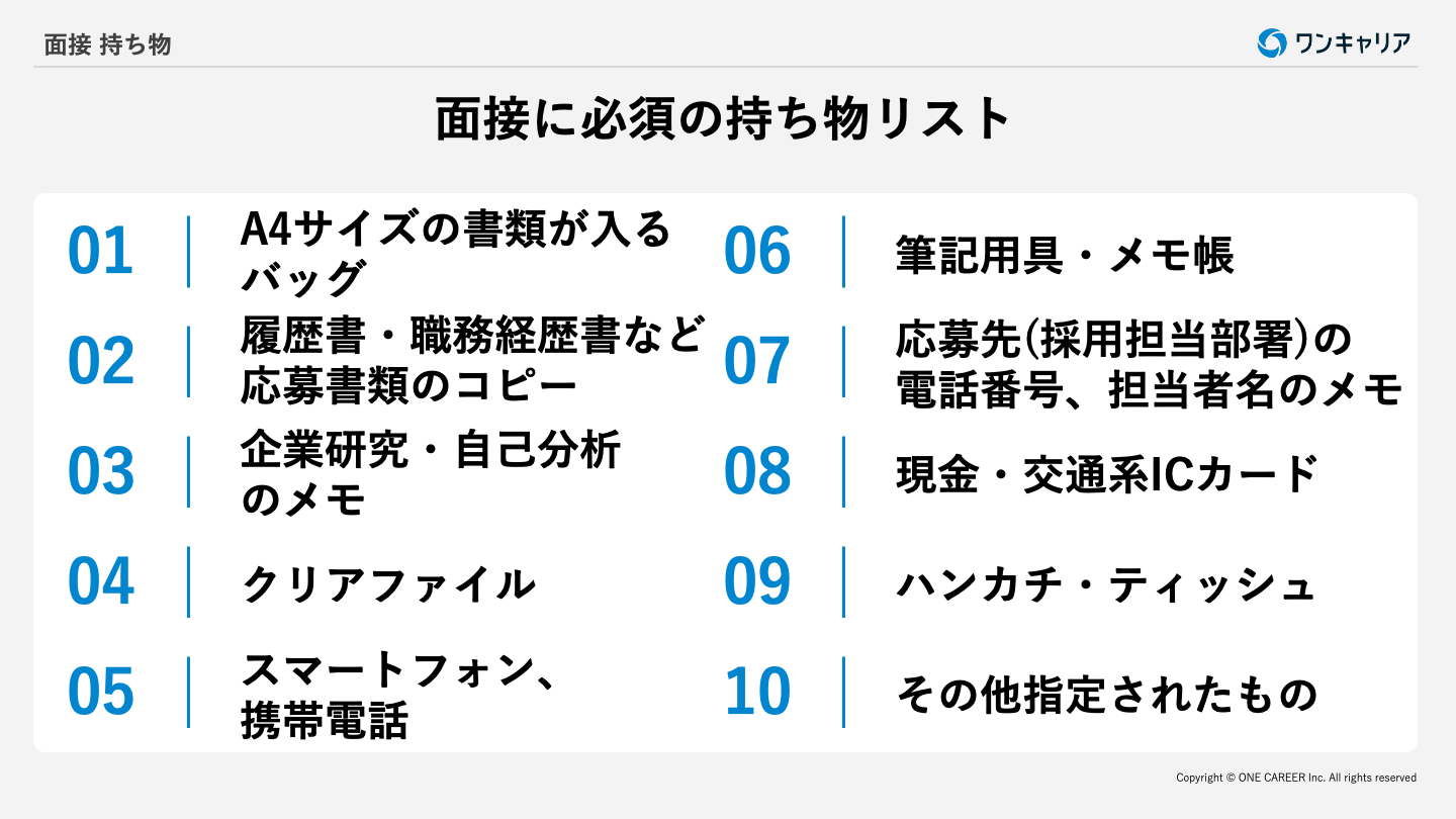 ●面接に必須の持ち物チェックリスト ⬜︎ A4サイズの書類が入るバッグ ⬜︎ 履歴書・職務経歴書など応募書類のコピー ⬜︎ 企業研究・自己分析のメモ ⬜︎ クリアファイル ⬜︎ スマートフォン、携帯電話 ⬜︎ 筆記用具・メモ帳 ⬜︎ 応募先(採用担当部署)の電話番号、担当者名のメモ ⬜︎ 現金・交通系ICカード ⬜︎ ハンカチ・ティッシュ ⬜︎ その他指定されたもの ●面接当日に役立つ便利アイテム ⬜︎ 面接会場周辺の地図 ⬜︎ メイクポーチ ⬜︎ 身分証明書 ⬜︎ 印鑑 ⬜︎ 腕時計 ⬜︎ 予備のストッキング ⬜︎ 折りたたみ傘 ⬜︎ 薬・絆創膏 ⬜︎ 口臭・消臭ケア用品 ⬜︎ モバイルバッテリー ⬜︎ 眼鏡・コンタクトレンズの予備 ⬜︎ マスクの替えやケース