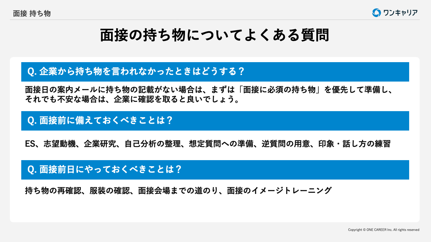 本記事では、面接当日に忘れ物をしないために、「必要な持ち物」と「あると便利な持ち物」を紹介します。