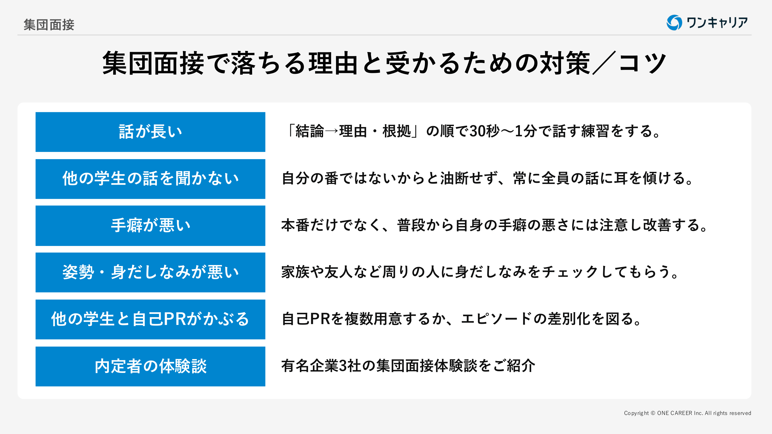 【集団面接に落ちる理由】 話が長い、他の学生の話を聞かない、手癖が悪い、姿勢や身だしなみが悪い、他の学生と自己PRがかぶるなど