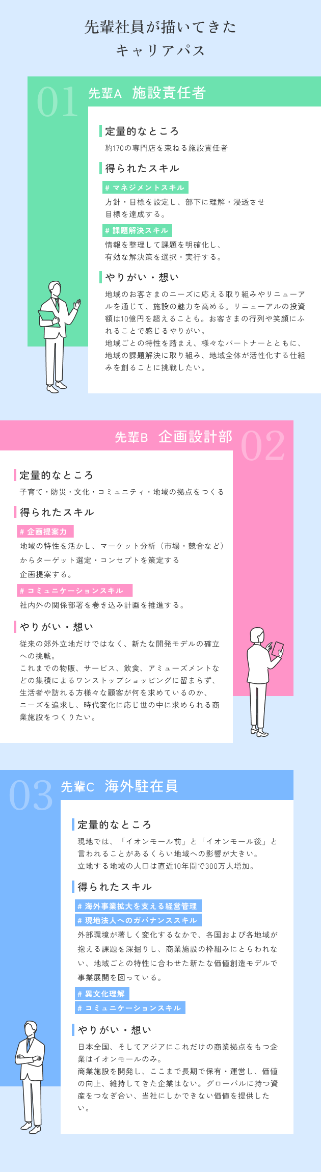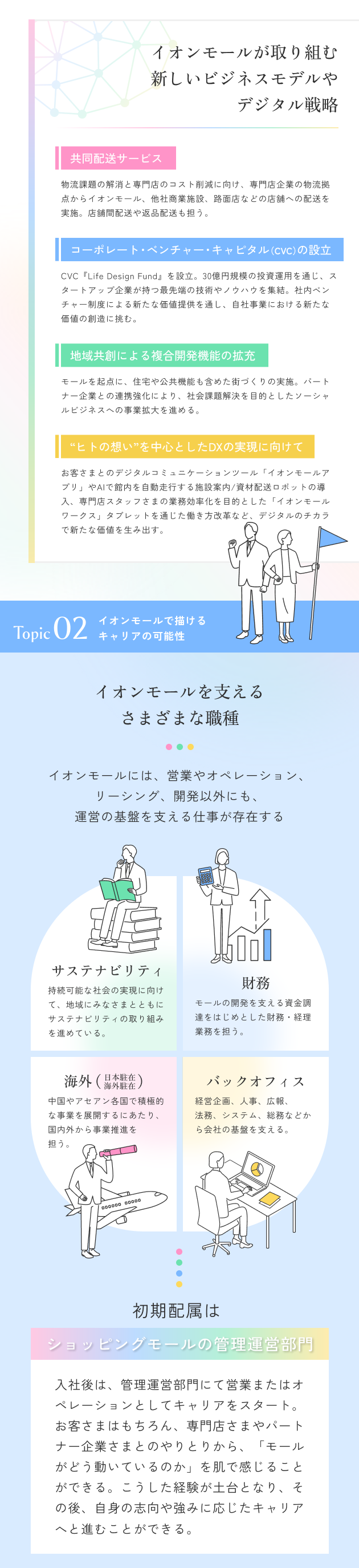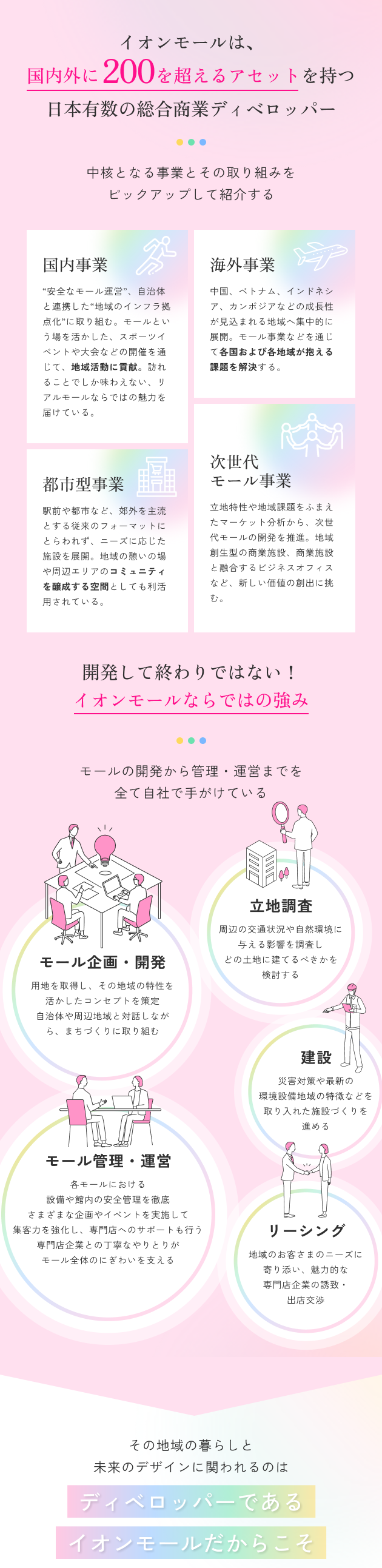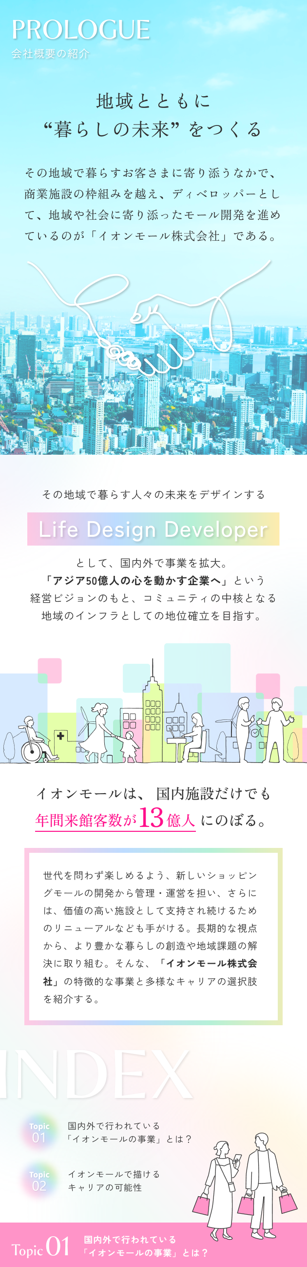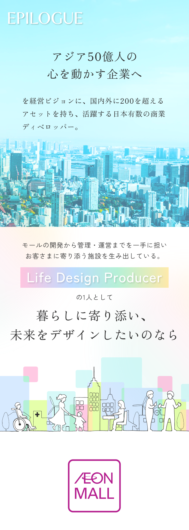 イオングループの中核を担い、国内外で約200のショッピングモールを展開するイオンモール。「Life Design Developer」を掲げる同社が見据えるのは、単なる商業施設の運営に留まりません。ライフステージに寄り添った機能拡充や文化育成を通じ、地域社会の「暮らしの未来」そのものを創出しています。 本記事では、アジア50億人の市場を視野に感動を届ける同社の事業と、その壮大なビジョンを実現するためのキャリアを紹介します。