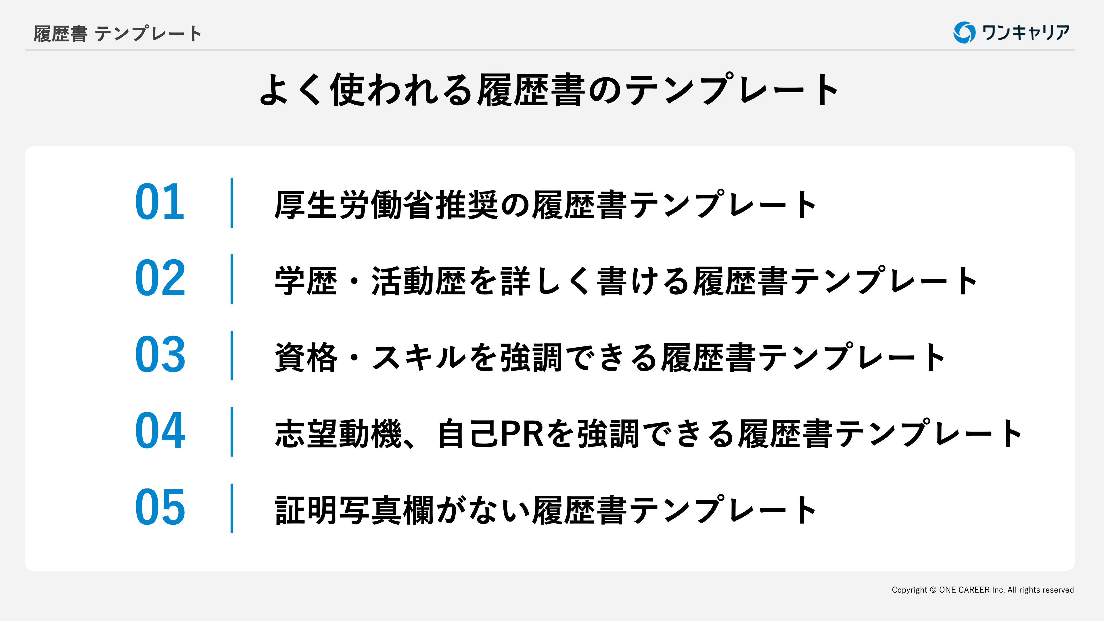 <目次> ●【5選】よく使われる履歴書のテンプレート(Word、Excel、PDF) ・厚生労働省推奨の履歴書テンプレート ・学歴・活動歴を詳しく書ける履歴書テンプレート ・資格・スキルを強調できる履歴書テンプレート ・志望動機、自己PRを強調できる履歴書テンプレート ・証明写真欄がない履歴書テンプレート ●Word、Excelソフトがない人向けの履歴書テンプレート(スプレッドシート) ●【形式別】履歴書テンプレートの使い方 ・パソコンで作成する場合の使い方(Word、 Excel、スプレッドシート) ・手書きで作成する場合の使い方(PDF印刷) ●履歴書の各項目の書き方とポイント ・印鑑 ・日付 ・写真 ・氏名 ・住所 ・電話番号・メールアドレス ・学歴・職歴 ・趣味・特技 ・免許・資格 ・ゼミの内容・研究内容 ・学生時代に力を入れたこと ・自己PR・強み・弱み ・志望動機 ・本人希望記入欄 ●パソコンで履歴書を作る場合のポイント ・文字の大きさやフォント(書体)を統一する ・左寄せを行い、文頭をそろえる ・選択肢を囲む場合はきれいに丸(◯)をつける ●履歴書のテンプレートに関するよくある質問 ・Web上の履歴書テンプレートを使っても大丈夫ですか? ・大学指定の履歴書を使用しないといけないですか? ・ダウンロードした履歴書テンプレートを自分用にカスタマイズしてもよいですか? ・JIS規格の履歴書を使用してもよいですか? ・履歴書のサイズはA4とB5のどちらを選べばよい? ・履歴書に書くことがない場合、空欄で提出してもよい? ・履歴書に「同上」と書いてもよい? ・履歴書の日付欄に「いつの日付」を記入するのが正しい? ・履歴書に証明写真を載せなくてもよいですか? ・履歴書の証明写真はいつ頃の写真まで使用できる? ・作成した履歴書の提出方法は? ●まとめ