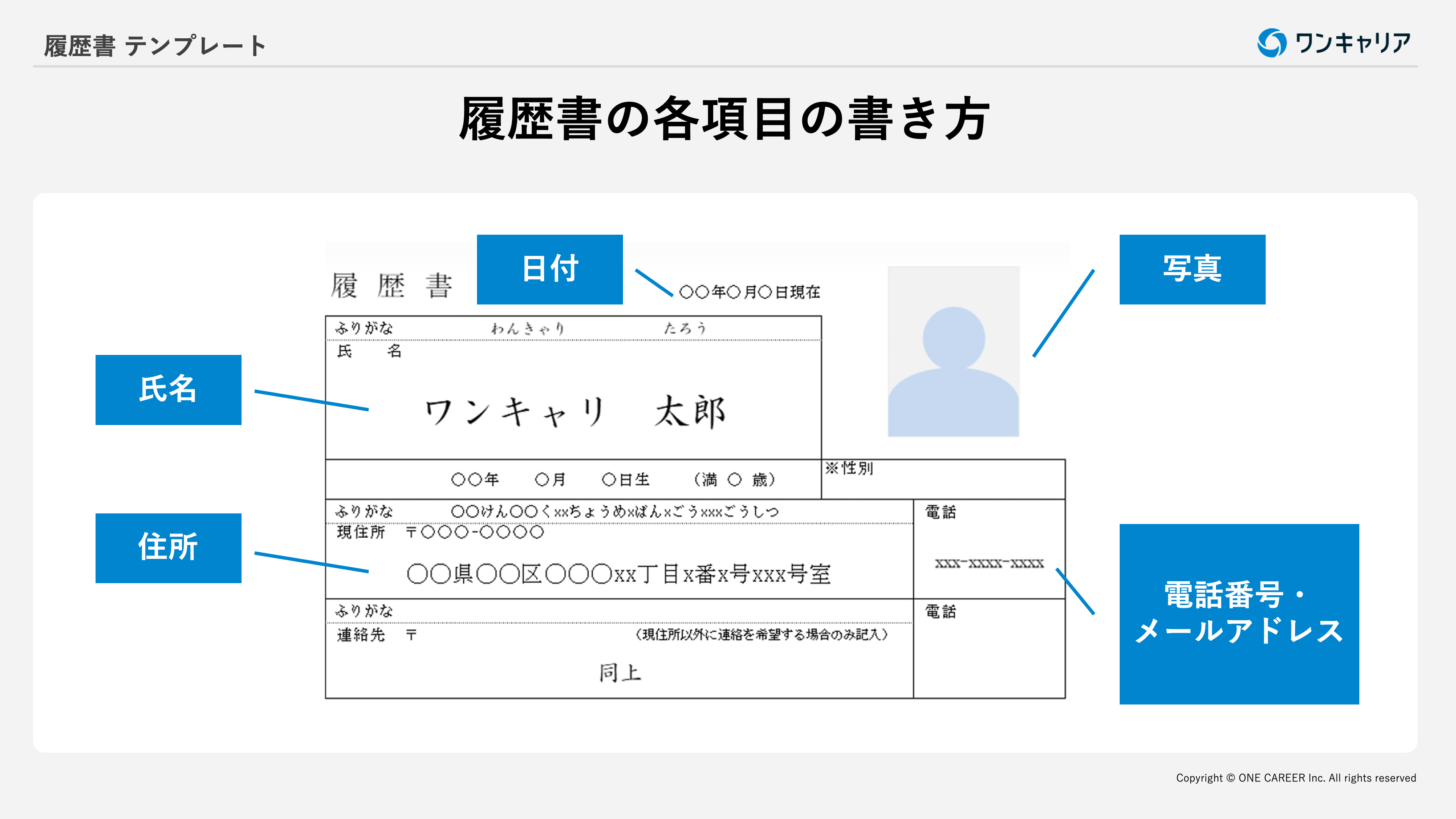 電話番号は、日中連絡がつく連絡先を記載してください。必ずしも固定電話である必要はなく、携帯電話やPHSの番号で問題ありません。メールアドレスは、社会人としてふさわしいアドレスを書き入れます。