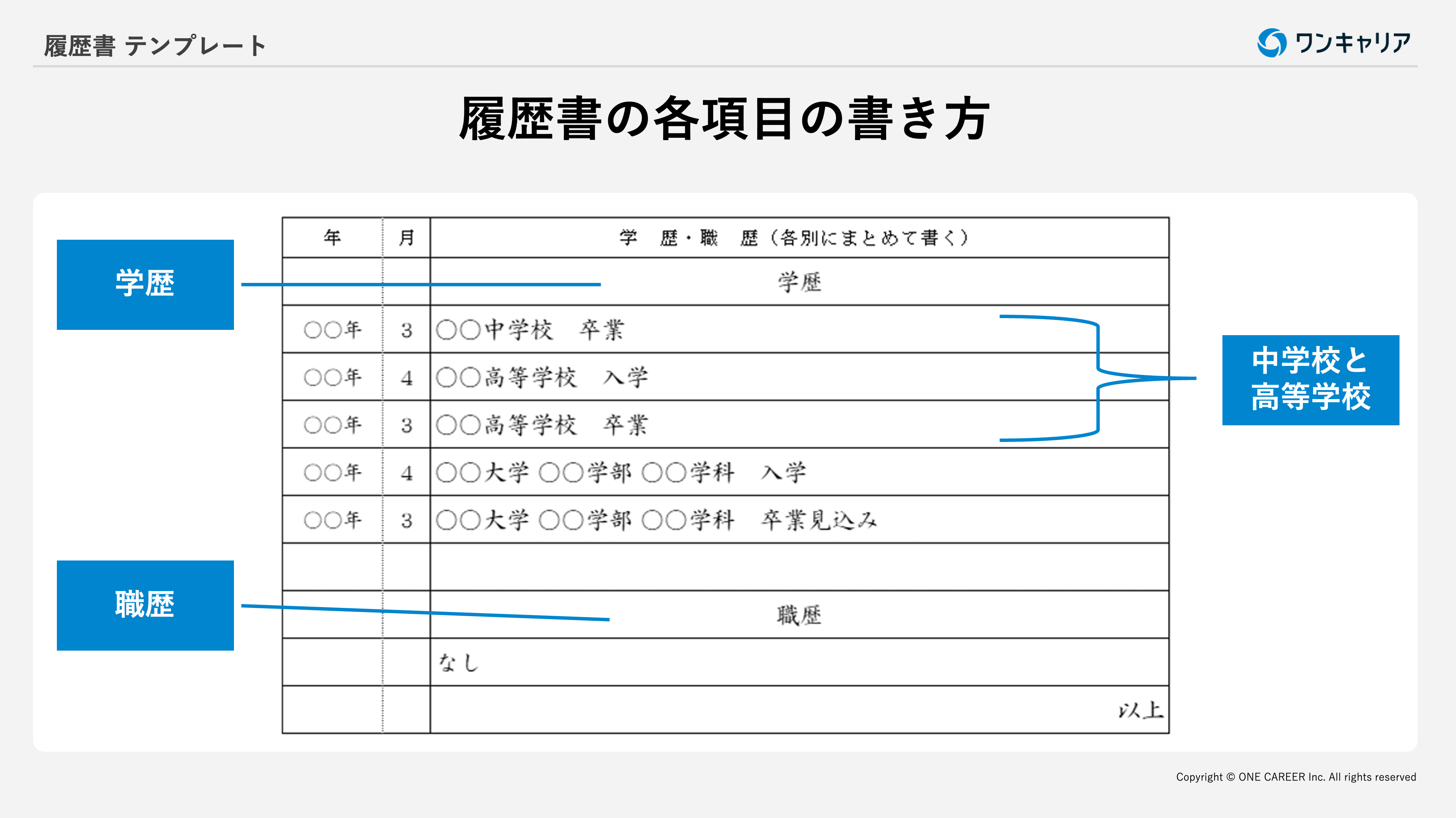 表が1つにまとまっている様式では、1行目に「学歴」と書き入れて、2行目以降から出身校の情報を書き入れます。その後の「職歴」についても同様です。