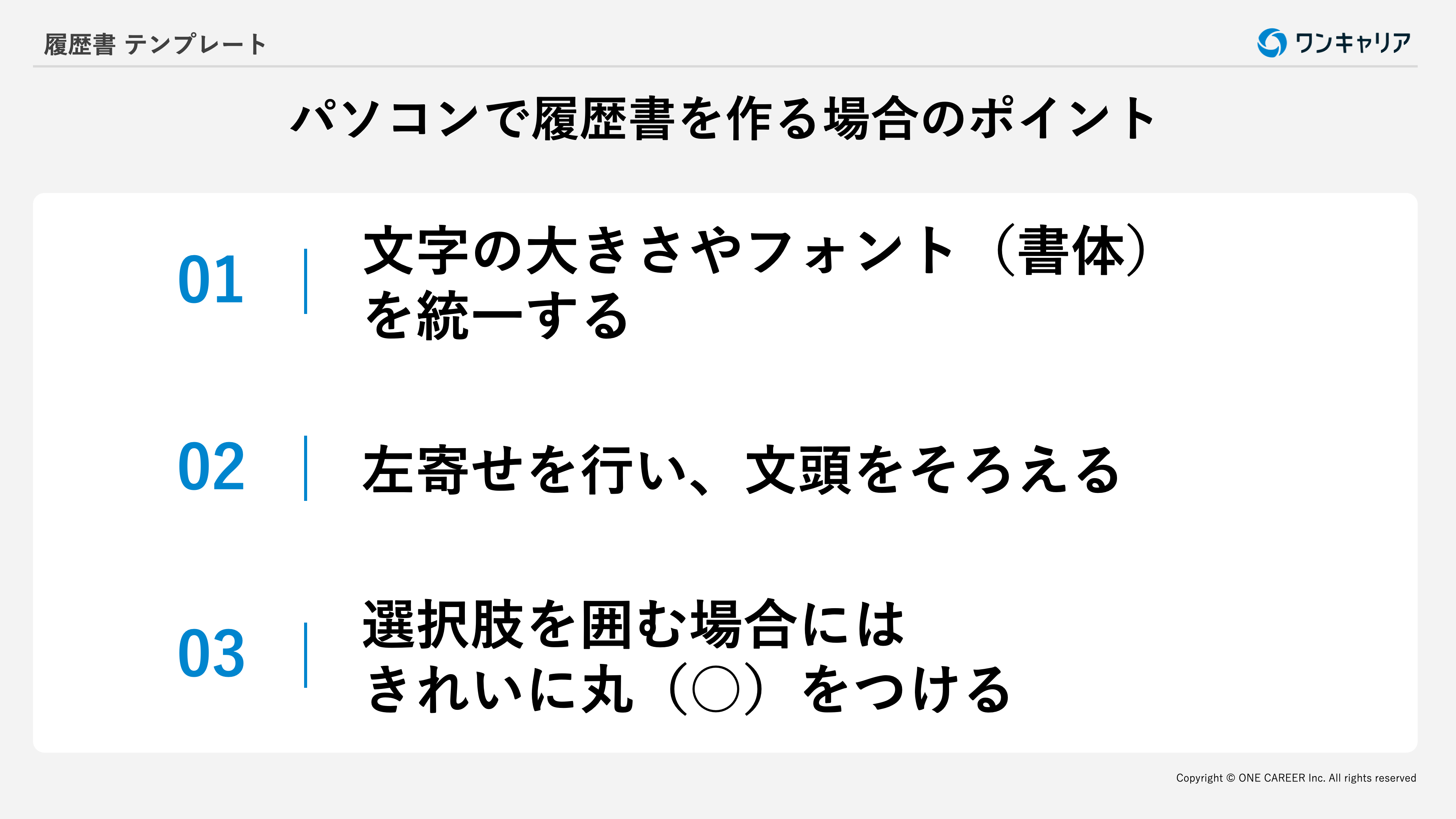 パソコンで履歴書を作成すると、文字をきれいにそろえられ、修正もしやすいというメリットがあります。ただし、見やすさや統一感を意識しないと、かえって読みにくくなることもあります。ここでは作成時に意識したいポイントを紹介します。