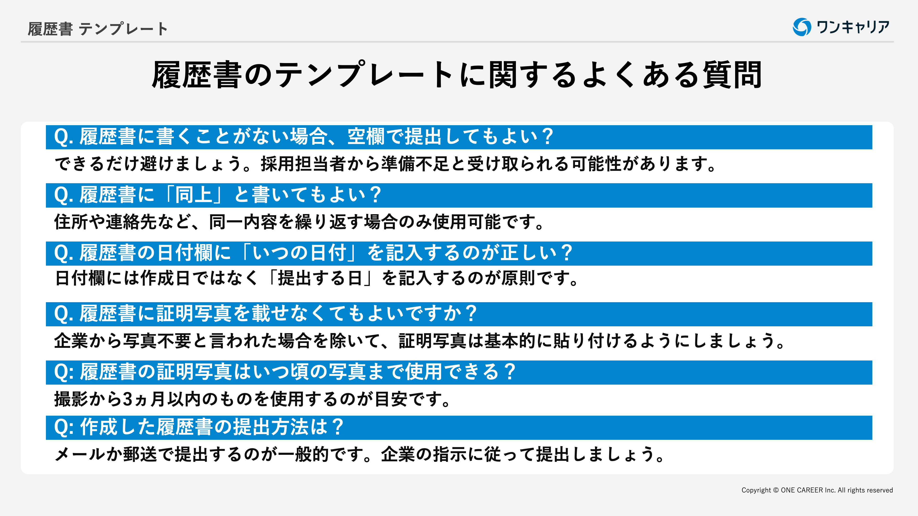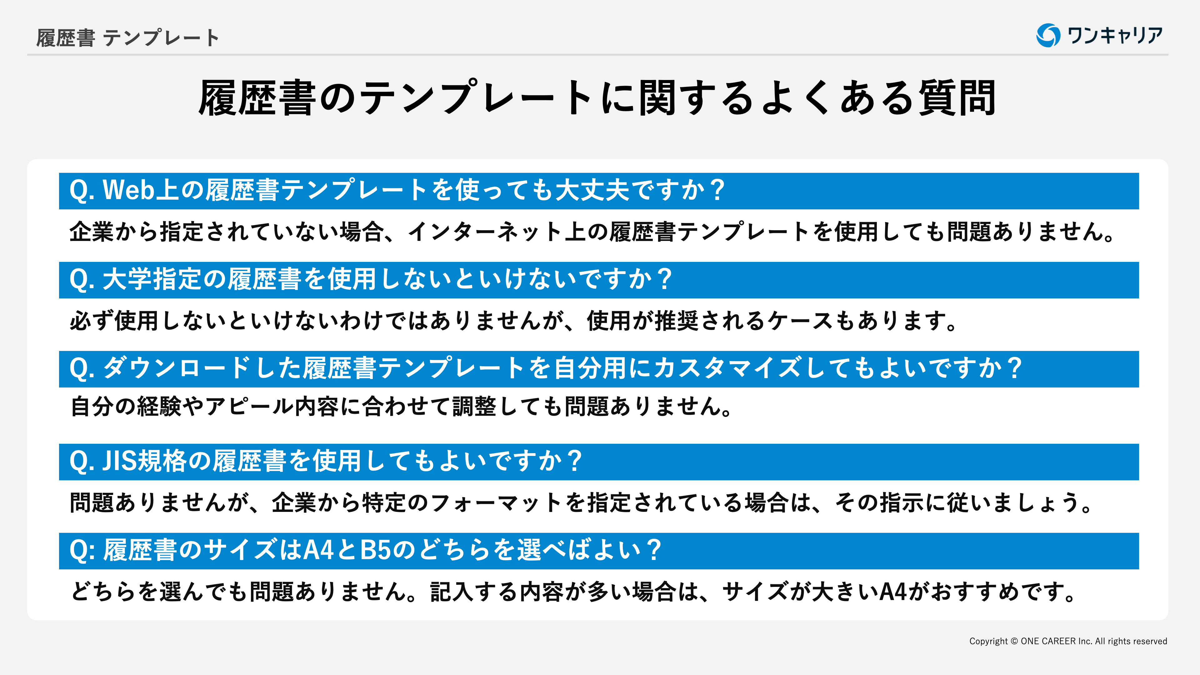 履歴書のテンプレートを使用する際、「どの形式を選べばよいか」「カスタマイズしても問題ないか」など、さまざまな疑問を持つ人も多いでしょう。ここでは、履歴書作成でよくある質問とその回答をまとめて解説します。