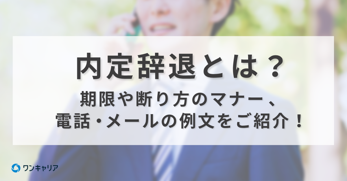 <目次> ●内定辞退はいつまでにすべき? 法的な期間とベストなタイミング ·法的な期限(民法627条)|14日以上前に告知すれば問題ない! ·内定承諾前でも内定辞退できる ·内定辞退のベストなタイミング ●内定辞退する際の基本マナー ·連絡手段は「電話」が原則 ·内定辞退を決めた時点ですぐに連絡する ·相手が対応しやすい時間帯で連絡する ·基本的に辞退理由を詳細に説明する必要はない ●内定辞退の連絡を「電話」で行う際のポイント ·必ず伝えるべき4つの要素|メモを用意し、要点をまとめておこう ●状況別|内定辞退の電話例文 ·【基本形】電話例文 ·【承諾前】「他社から内定が出た」ことを理由にする電話例文 ·【承諾後】「熟考した結果、別の道を選ぶ」ことを理由にする電話例文 ·電話がつながらなかった場合の対応 ●企業に「待った」と言われる! 内定辞退で絶対言ってはいけないNG理由 ·NG理由1. 「御社よりも給与や福利厚生で条件の良い会社を見つけた」 ·NG理由2. 「面接官の印象が良くなかった」 ·NG理由3. 「社風が合わない気がした」 ●内定辞退の連絡を「メール」で行う場合の例文と注意点 ·メールでの連絡が許容されるケース ·内定辞退の「メール例文」 ·返信が3~5日ない場合は電話で連絡を ●内定「承諾後」に辞退する際の注意点 ·内定承諾書を提出した後でも辞退は可能 ·内定辞退の撤回は基本的にはできない ●内定辞退に関するよくある質問(FAQ) ·Q. 辞退によって選考を受けている他の企業に影響は出ますか? ·Q. 辞退の連絡で怒られるのが怖いです。どうすればよいですか? ·Q. 内定辞退を引き止められた場合、どうすればいい? ·Q. 内定辞退の連絡をせず放置するとどうなる? ·Q. 内々定の段階でも辞退できる? ●おわりに