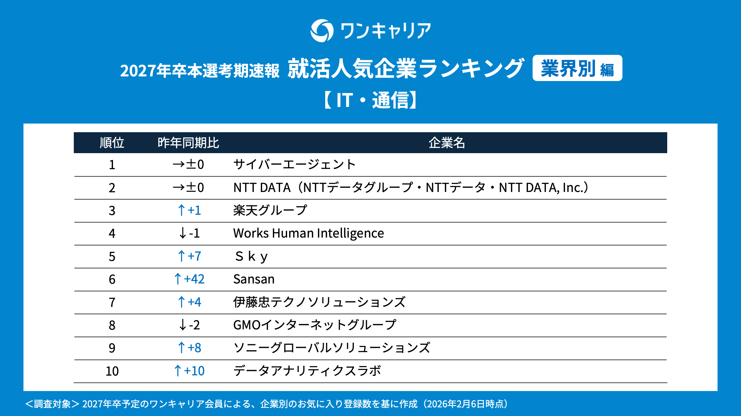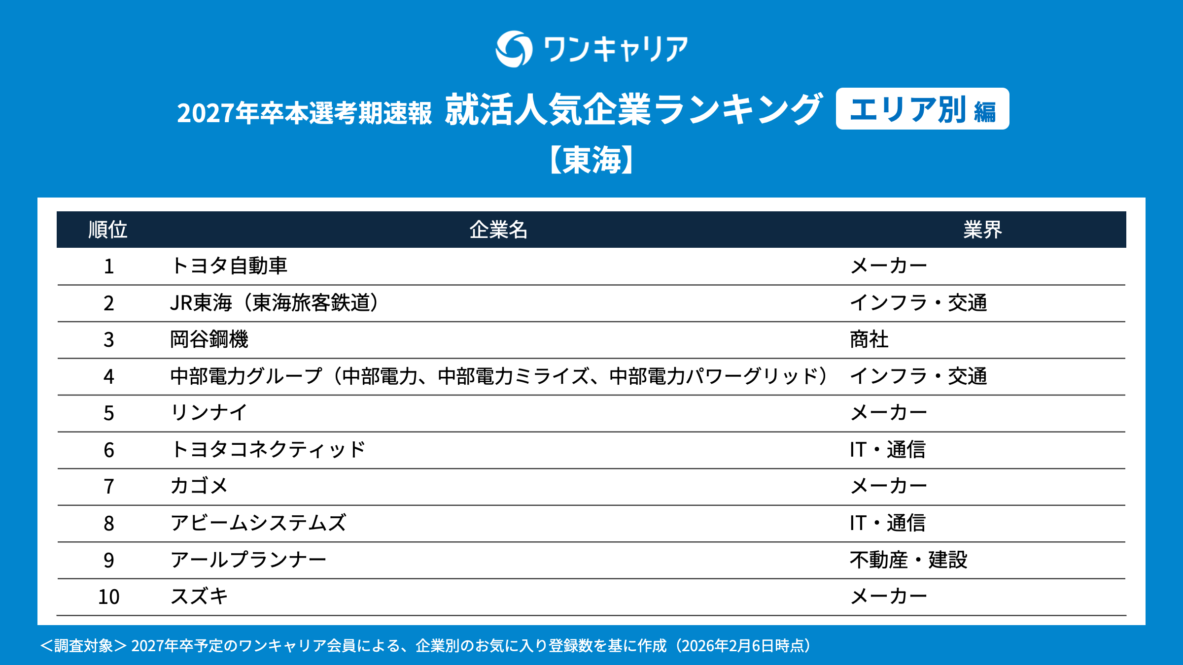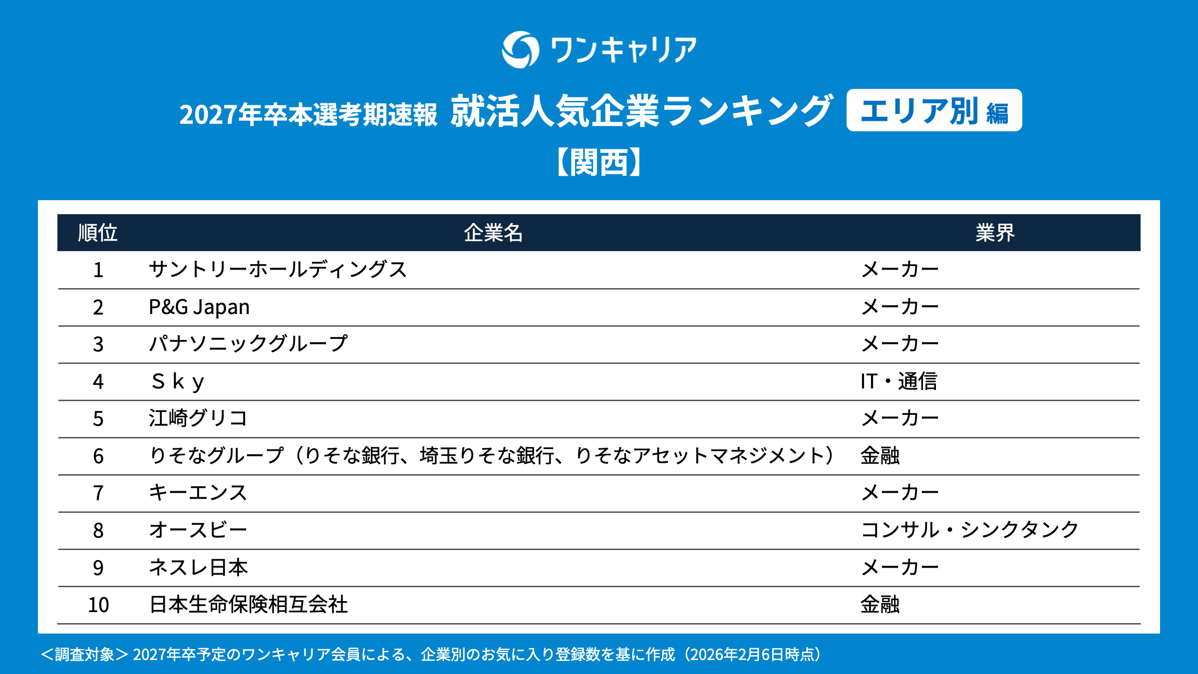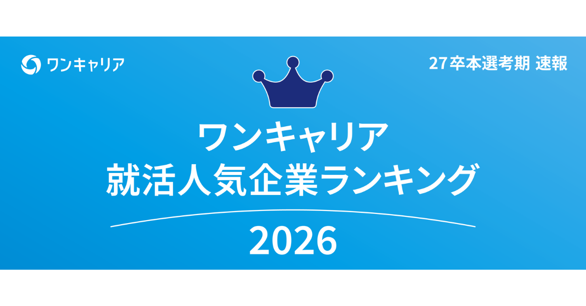 調査概要 ・調査名:ワンキャリア 就活人気企業ランキング【業界別編】(27卒本選考期速報) ・調査時期:2026年2月6日時点での実績値を参照 ・調査対象:就活支援サービス「ワンキャリア」のユーザーで、2027年3月卒業見込みの大学3年生・大学院1年生 ・調査方法:就活支援サービス「ワンキャリア」の企業ページ上の「お気に入り数」を基に集計 ・有効回答者数:120,094名
