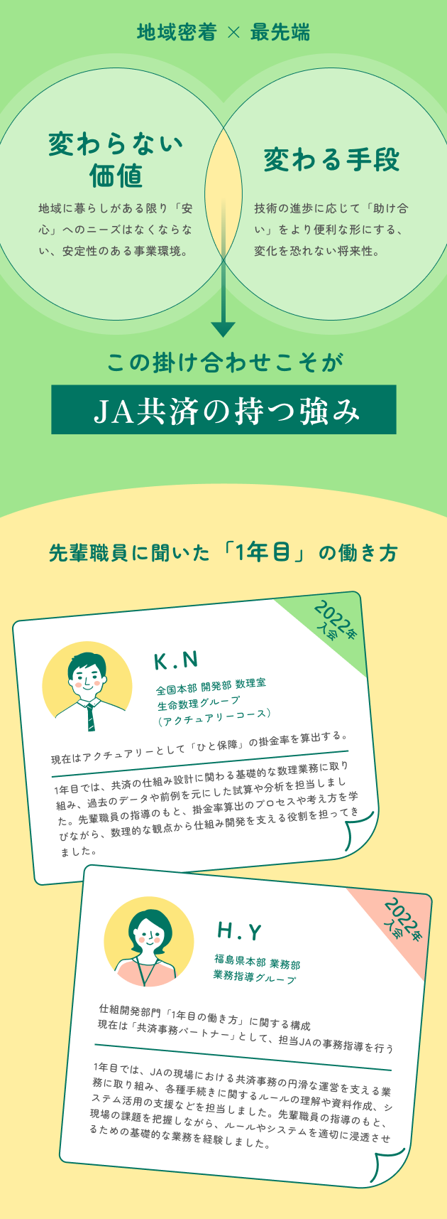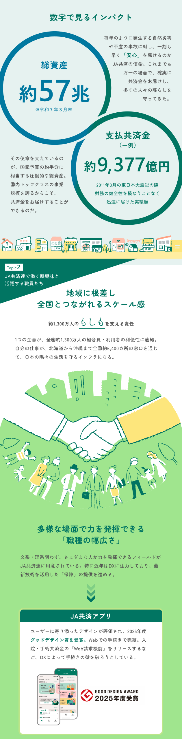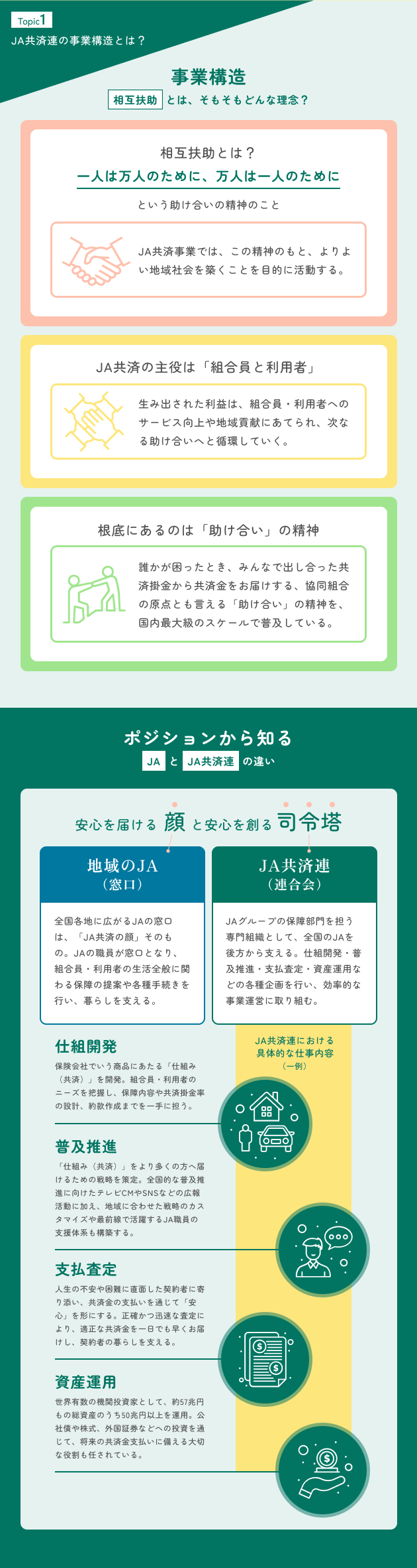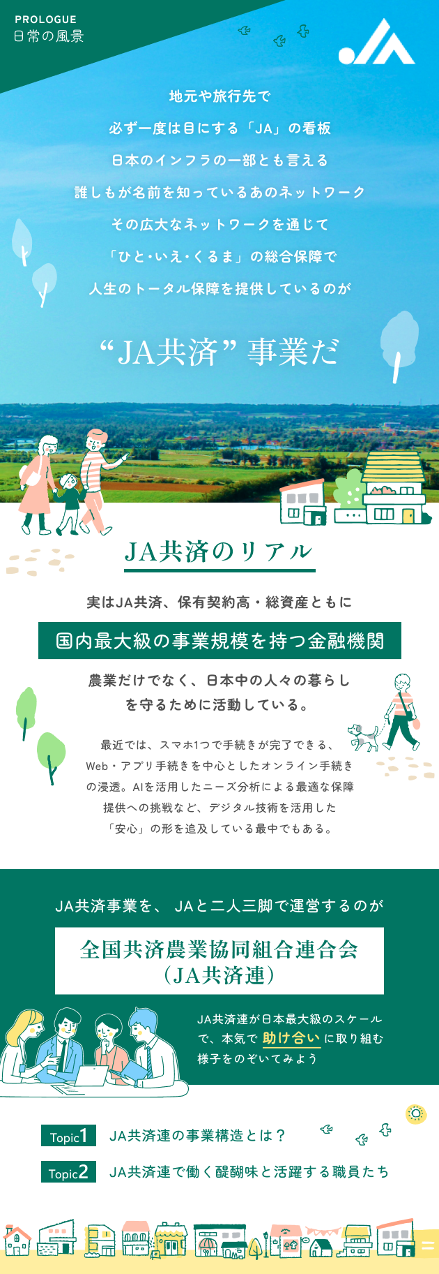 全国共済農業協同組合連合会(JA共済)は、全国のJAネットワークを通じて「ひと・いえ・くるまの総合保障」を提供する組織です。「相互扶助(助け合い)」を理念に掲げ、営利第一ではなく、農家から一般の方まで日本中の人々の暮らしを守っています。本記事では、「変化の時代を見据え、人々のために挑戦し続ける」JA共済連の事業構造と、そんな環境で働く醍醐味と活躍する職員を紹介します。