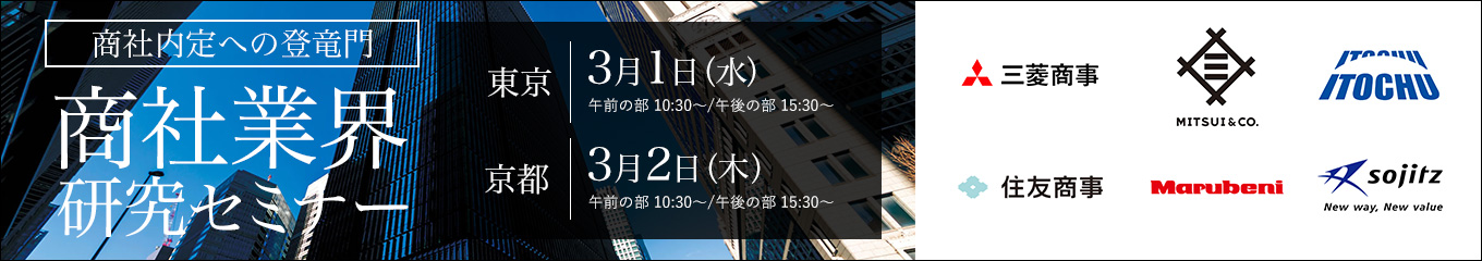 商社業界研究セミナー【3月1日(水)@東京/3月2日(木)@京都】→ 詳細はこちら
