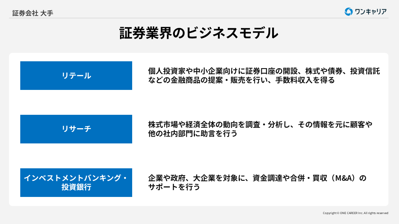 証券業界のビジネスモデルは、多岐にわたるサービスを通じて収益を得る構造となっています。証券会社が主に利益を上げる事業としては、リテールとリサーチ、インベストメントバンキング・投資銀行の3つが挙げられます。
