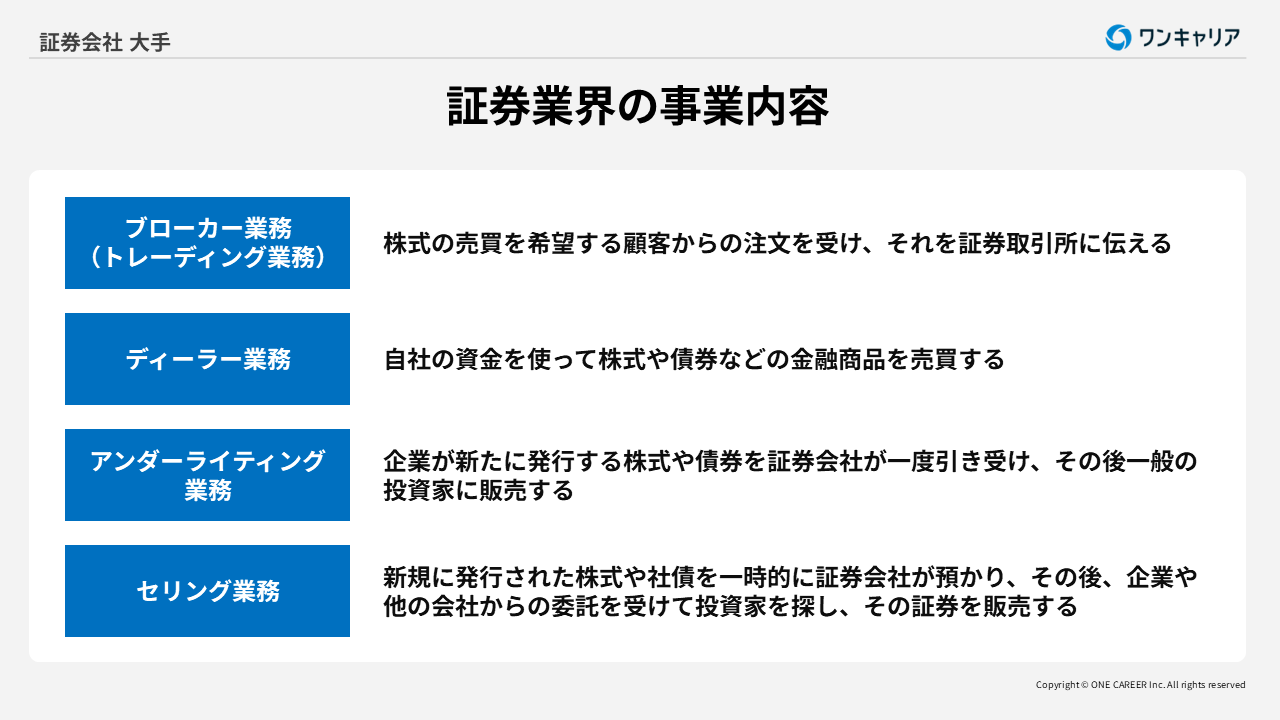 アンダーライティング業務は、企業が新たに発行する株式や債券を引き受け、市場に販売する役割を担います。セリング業務では、個人や法人の顧客に対して、投資信託や株式などの金融商品を販売し、資産運用のサポートを行います。ここからは、さらに各事業内容を深掘りします。