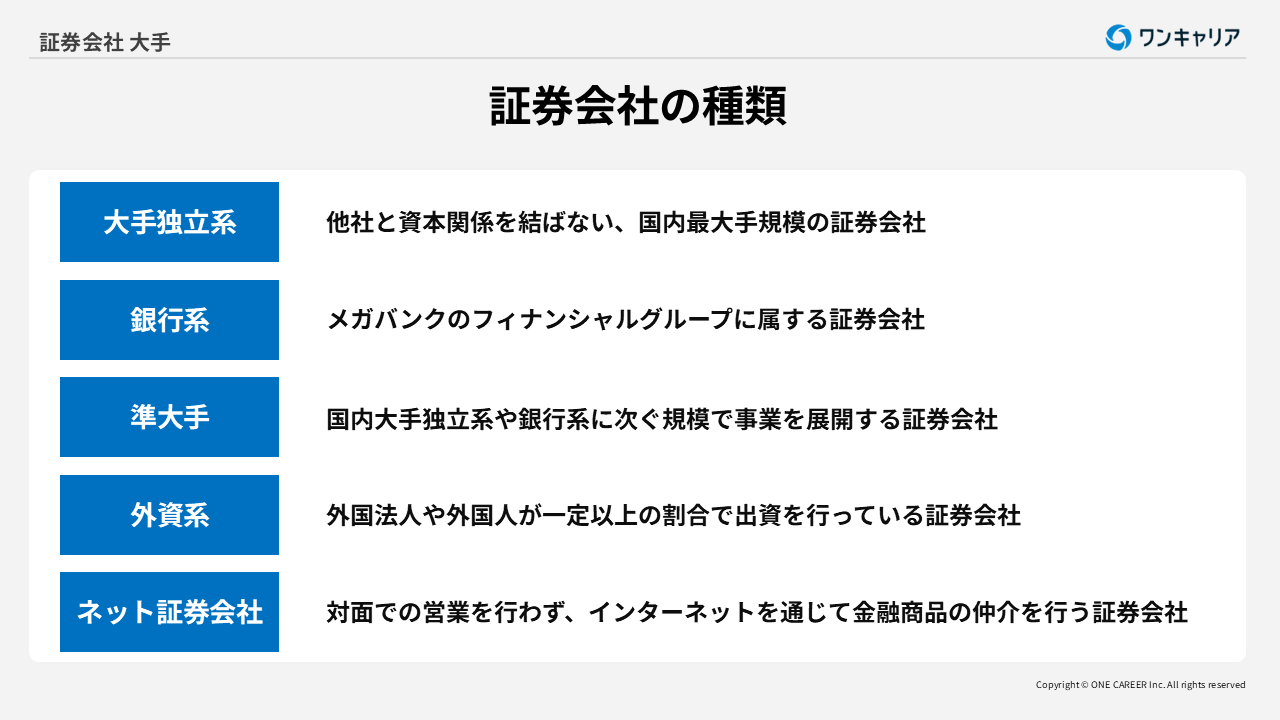 証券会社には、規模や経営母体によってさまざまな種類があり、それぞれが異なる特徴とサービスを提供しています。