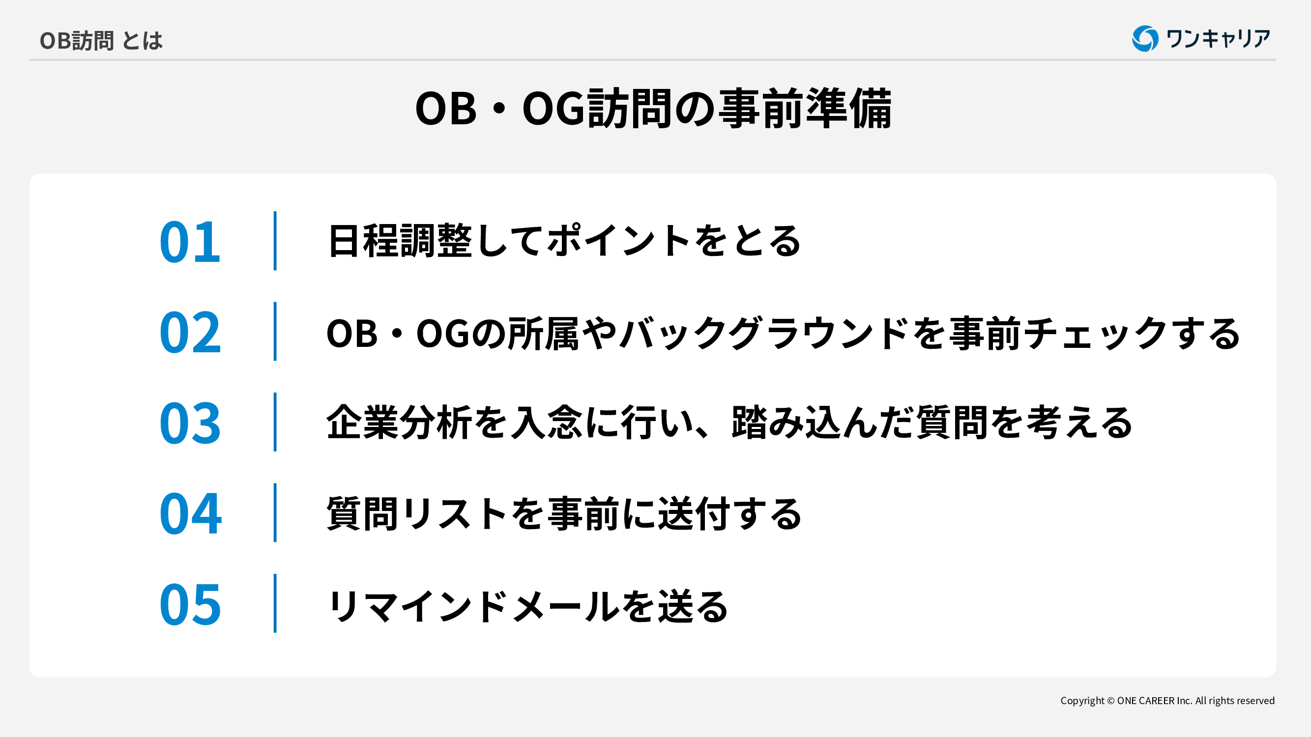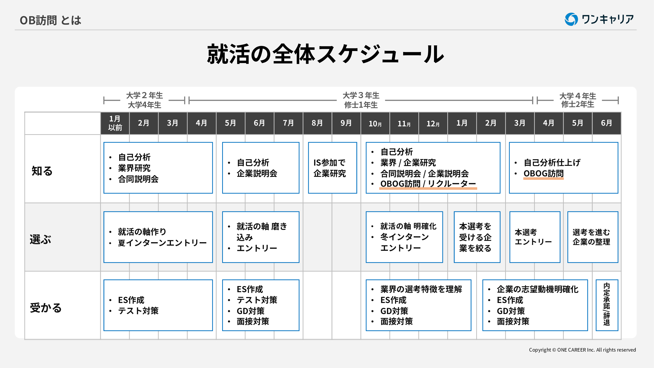 就活解禁後は選考準備で忙しくなり、またOB・OG訪問を希望する学生が増えるため、希望通りに実施できない可能性があります。余裕を持ち、なるべく早めにOB・OG訪問をしましょう。