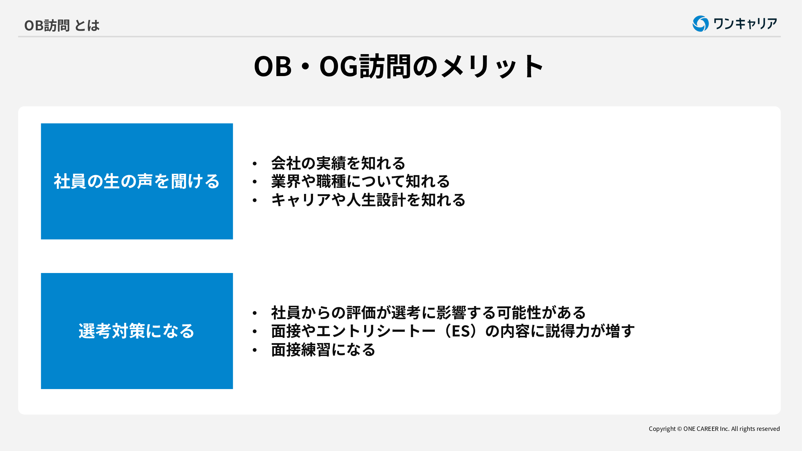 面接やESで「志望動機」や「キャリアプラン」がよく聞かれます。会社のホームページや説明会で得られる情報は多くの学生が知っています。OB・OG訪問で実際の社員から社風や事業内容、キャリアプランを聞くことで、より具体的で差別化された志望動機・キャリアプランを回答できるでしょう。