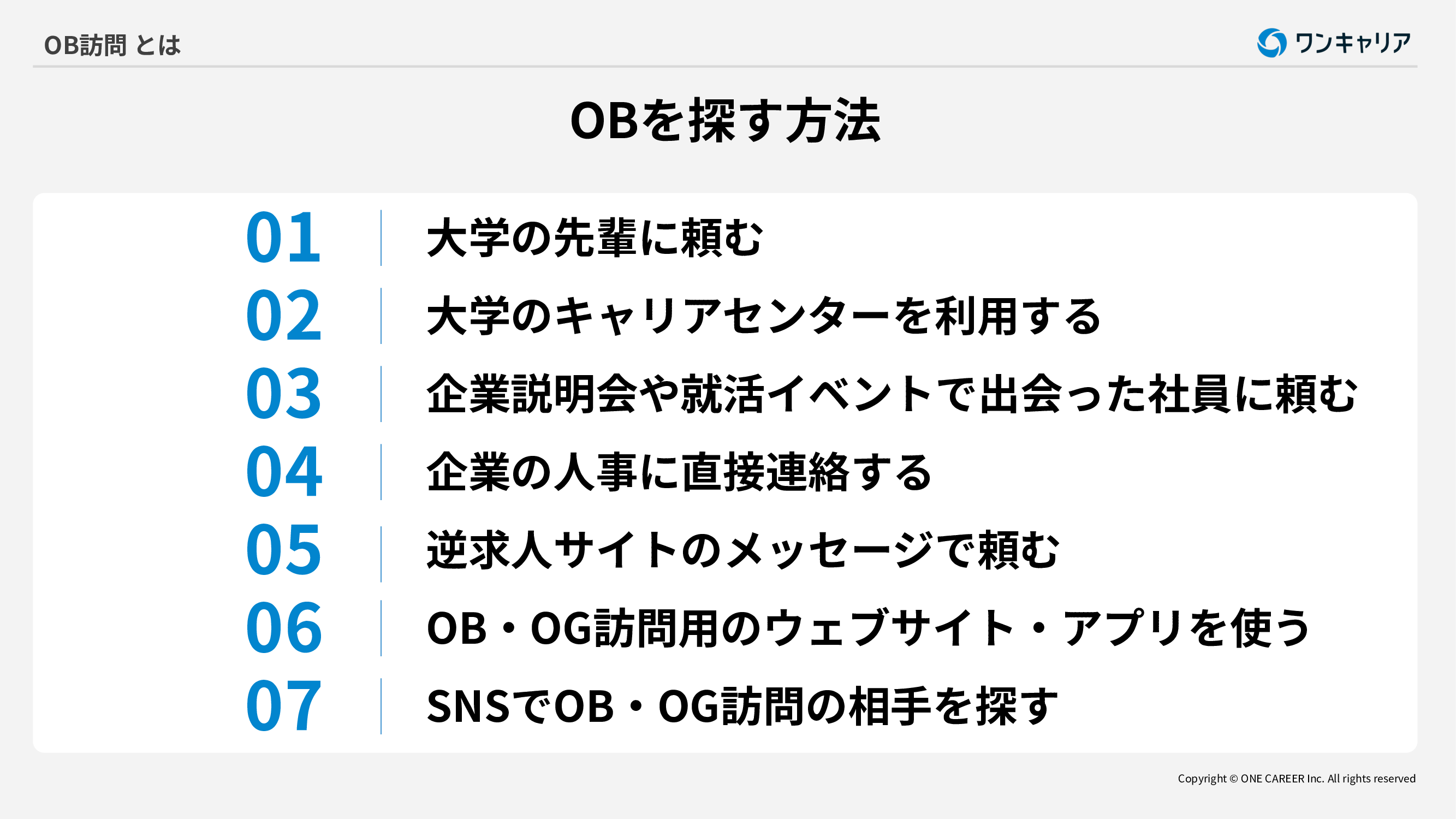 ここまで、OB・OG訪問のメリットをお伝えしました。ですが、OB・OGをどうやって探せばいいか分からない方もいるでしょう。そこで、OB・OGの探し方を複数ご紹介します。